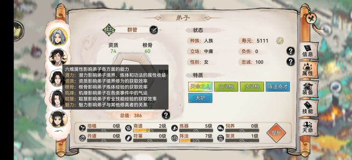 Hi,祖师们我是可爱的代言人小清瑶最近来了不少萌新祖师加入我们呢~所以小清瑶整理了一些游戏小技巧我们一起来看看吧开局必备!如何选择弟子在最强祖师这款游戏中,弟子分为战斗弟子和后勤弟子两个大类。在挑选战斗弟子中优先选择根骨/资质/潜力三个数值较高的弟子,在灵根上则是灵根词条越少越好,目前来说游戏中最好的灵根是单一的天灵根,比如常说的天火剑就是具有天火灵根的剑修。对于后勤弟子则根据需求选择对应
