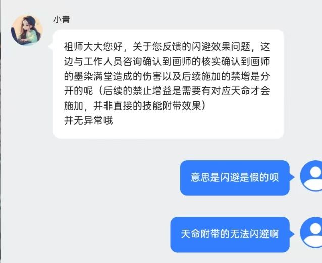 大话联动,看着紫霞高闪避机制挺有意思的,想着卫寒、萧辰、紫霞可以组队玩玩,抽完弟子后对游戏闪避机制进行了一些测试。 我们首先看一下游戏的闪避机制介绍: 游戏给的指南里说闪避一次伤害,附带的效果也会被闪避,但实际情况并非如此。下面视频显示萧辰闪避后还是被禁增。 带着这个疑问咨询了客服,时间过去一周才得到答复。 客服回答很有趣,翻译过来就是:闪避是可能的,但闪避通过其他途径附加的技能效果不太可
