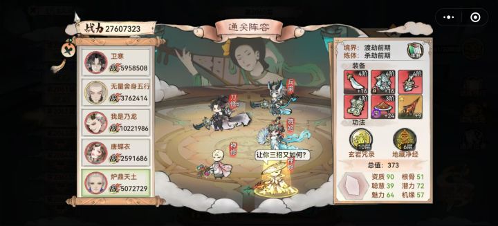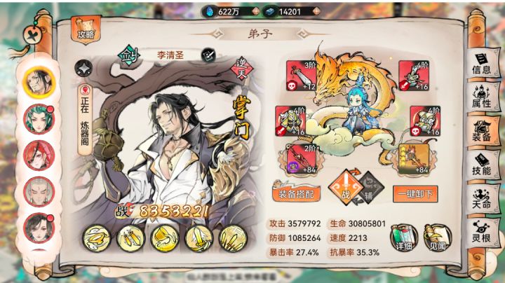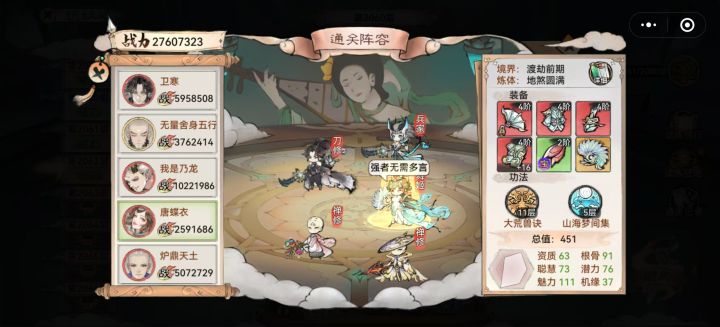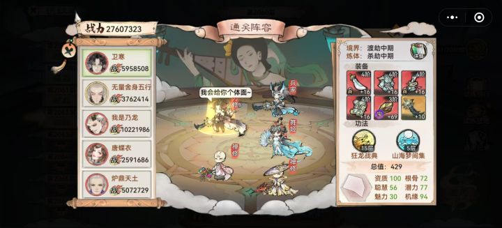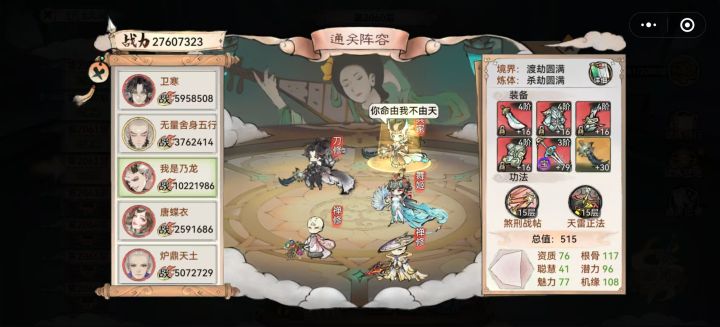 当你没有好的输出时,这里就有现成的剑仙--李清圣天命选择可以自由配置,长生:10%生命增加生存,雷霆:20%暴击伤害输出,灵动:30%法宝蓄力增加30暴伤,队友倒下回复生命并增益状态潜力是影响属性的关键,境界/炼体的加成,每1点加1%。酗酒增加10%抵抗效果,以理服人加5%物伤减3%法伤(完全没必要)。火系法宝,炼化暴伤配合天命被动增加火系功法威力加百分比攻击,百炼真元怎会是普通的装备