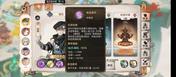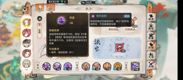 游戏阵容要求5个弟子,个人建议前排禅修两个后排:剑修,剑修 舞姬云瑶,氪佬:银无月,五行禅,剑修,画家,云瑶开始就随便玩,可以先用天命高的,弟子可以花费灵玉传功,丹药不算浪费,混沌灵魄不要随便用,传功后会变成弟子的灵魄,普通的天命灵魄可以随便用,传功后会返还禅修:前期可用免费送的熊猫,后期更换五行禅:带有五个灵根,带有天命【“禅心”:战斗开始时可获得一回合果免疫】,功法推荐渡魂歌诀(可换为风魄