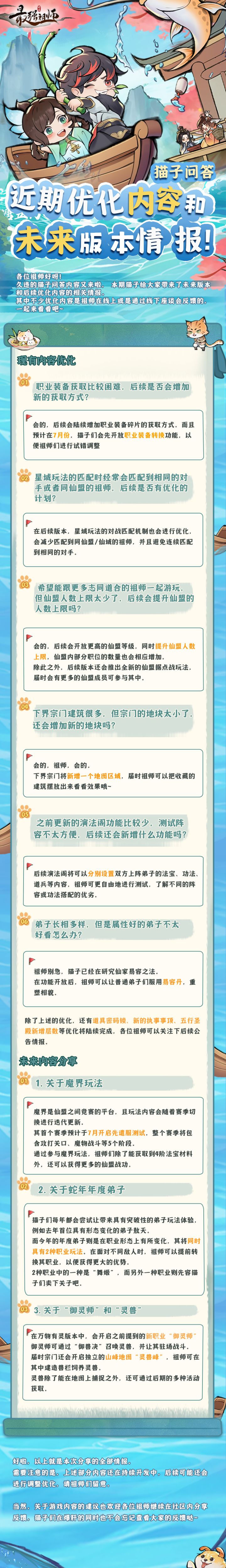 各位祖师好呀!今天在广州线下举办的第二届祖师座谈会已圆满结束。座谈会期间,祖师不仅与猫子们进行了深入的玩法探讨,同时也进行了精彩的对战比赛。小清瑶记录了不少精彩瞬间,一起来围观下吧~版本前瞻分享在上期座谈会中,猫子们提前分享了未来版本的内容,而在本期座谈会上,全新的内容爆料也依旧不少。除了有全新弟子的立绘展示,猫子们还介绍了魔界的玩法规划,并展示了后续版本中灵兽相关的内容。同时,正在