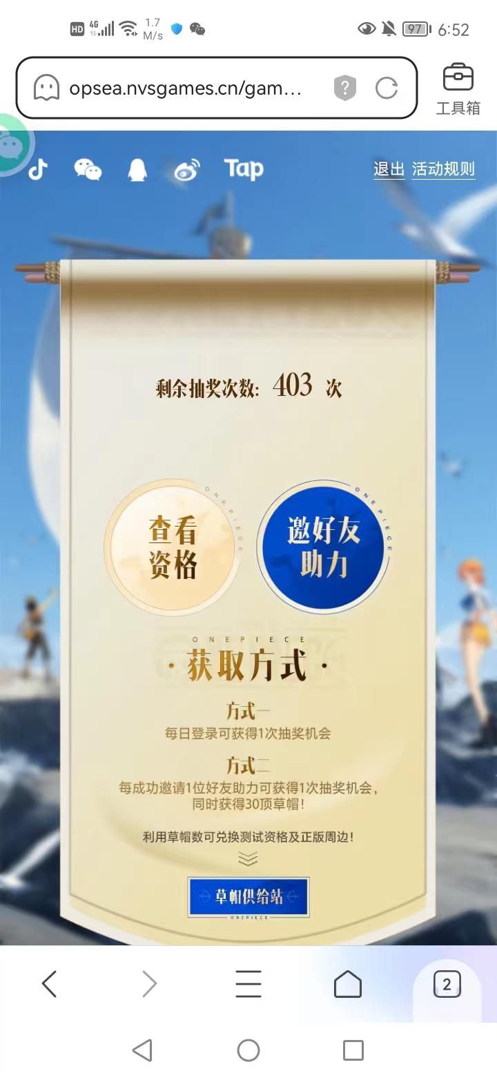 第一种,抽取内测资格,链接如下。 大家点进去,就可以获得一次抽奖,有可能会获得内测资格。https://opsea.nvsgames.cn/game_channel/qianghao?code=JJJG6LU6&uid=474583085358296 第二种,预约获得内测资格,链接如下。 大家点进去,先预约才有兑换的资格,做任务获取草帽,集齐40草帽,兑换资格!https://opsea.nvsgames.cn/game_channel/jifenzhan?pie_0d80460b=1i74512irfrbi