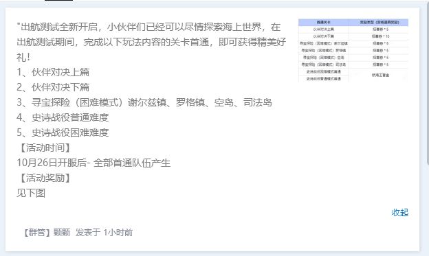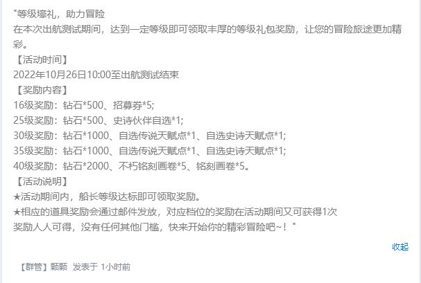 给不在Q群的同步下Q群活动(邮件直接发的不在Q群也能有)关卡首通给招募卷(具体关卡看截图)做任务阅历到60可以参加第二天的航海宝藏抽奖,(抽招募卷)升级奖励(钻石+招募卷,史诗伙伴,传说/史诗天赋点,不朽铭刻/铭刻画卷)