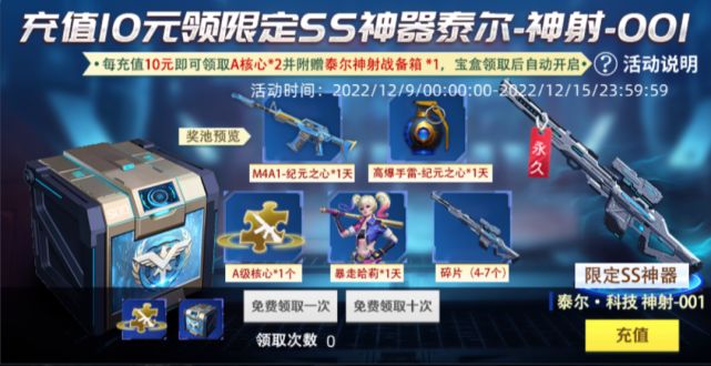 本文首发【全民营地】公众号,未经授权禁止“抄袭文章”转载至其它平台。全民枪神中有各种各样的武器,他们的外形和性能都各不相同,还有些顶级武器有着离谱的技能,在全民枪神这款游戏中拥有把好的武器对玩家实力是有巨额增幅的。全民枪神边境王者中,每隔一段时间,官方就会推出神器的获取活动,活动中会放出一些活动独占的限时武器,今天官方又更新了10元充值活动,这次活动可以领取许多福利奖励,最终奖励是限定神器SVD