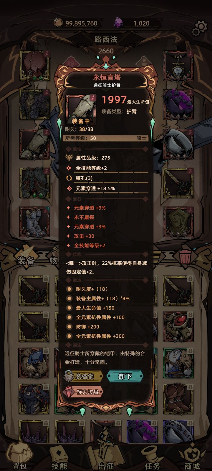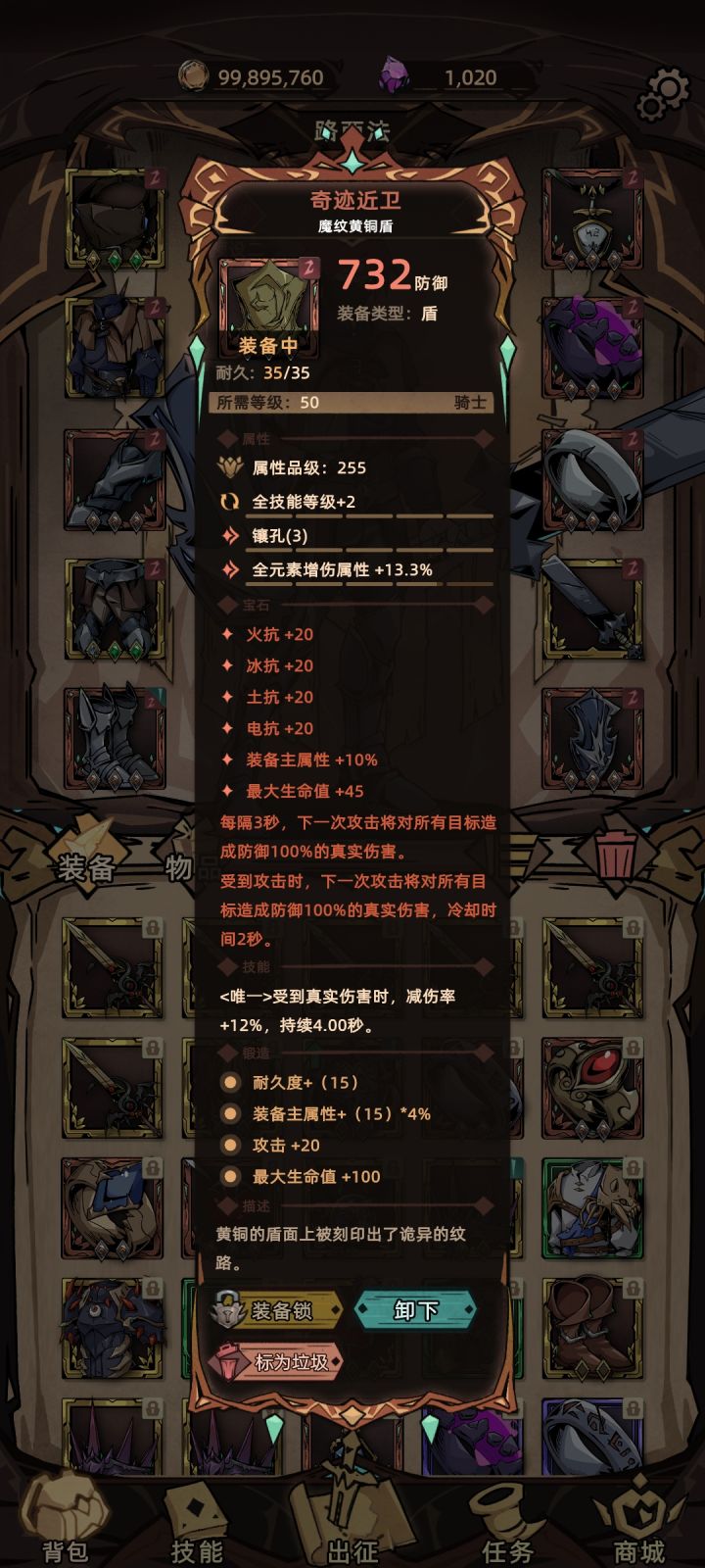 写在前面的话:本攻略只为研究盾勇的极限推塔,非正常盾勇的出装,输出很低,而且需要搭配氪金神器戒指,新手玩家不建议参考。一、出装思路对于所有尝试极限正塔的职业,需要明白的一点是,限制正塔层数的因素只有一个:生存。输出的高低在正塔里并不重要。盾勇作为全职业坦度最高的职业,总有极高的防御,几乎免疫物理伤害,能克制盾勇的只有真伤和元素伤害。这两种伤害目前并没有特别有效的减免手段,尤其是真伤,只能被