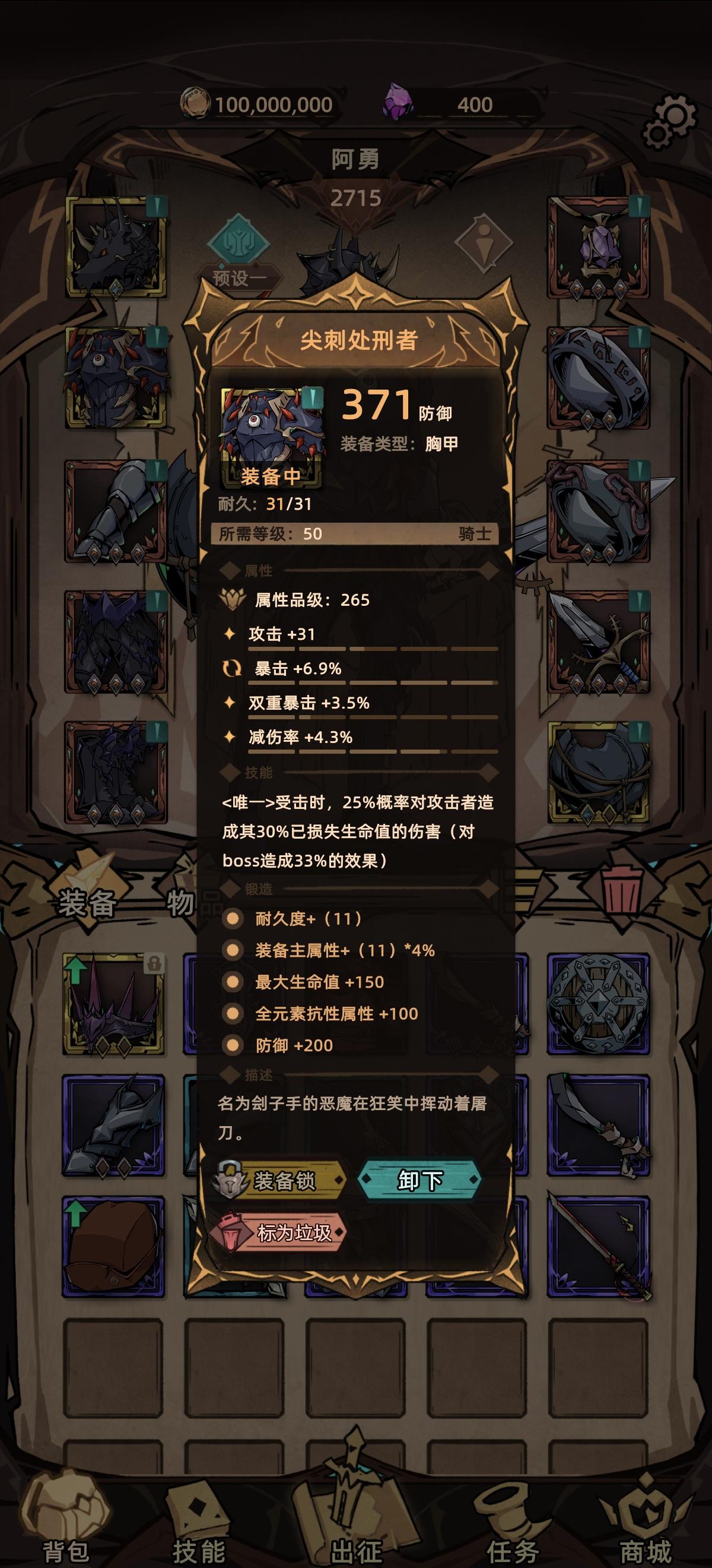 经过两三天的努力,大概把角色完成度建设到了70%左右,再玩下去也就是镶宝石,叠属性和伤害了,也可能还会出一两件不错的装备,但总的来说也就如此了!现在总结一下:任何职业都以技能等级,作为稳定输出的基础!所以尽可能先提高技能,保证稳定的输出(装备技能不要超过15),其次以高攻高爆为目的叠加属性,其中刷塔降肃必不可少,但不用太高,五六十即可!暴击够用就行,尽量要叠加爆伤,终伤!至于双重暴击有些虚无缥缈