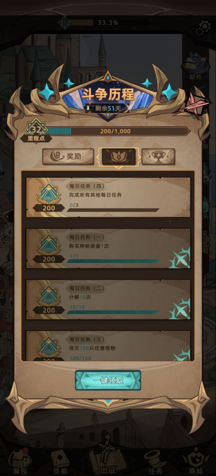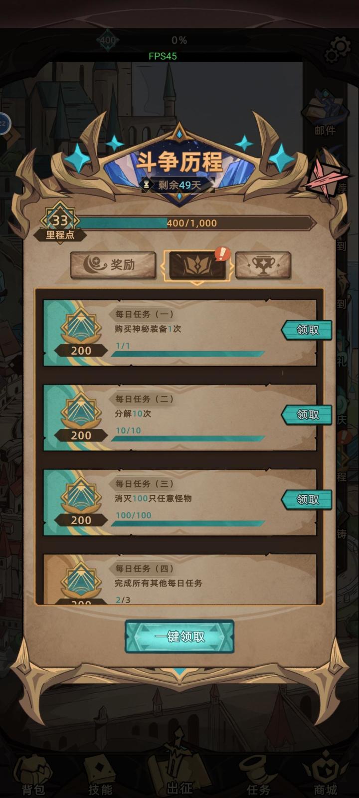 连续两天了,那个任务都完成不了无论先领还是后领,不知道是什么问题怀疑是熬夜跨天的问题,问下这游戏白天几点更新找到解决办法了,6点每日更新在六点后登录游戏在没完成其他每日之前先把神秘装备买了。其他任务完成不领取也不算数,必须其他任务未完成的情况下先买神秘装备,尤其是注意6点更新不要在6点之前肝忘了直接跨日,跨日直接就完成打怪任务神秘装备就没办法完成了