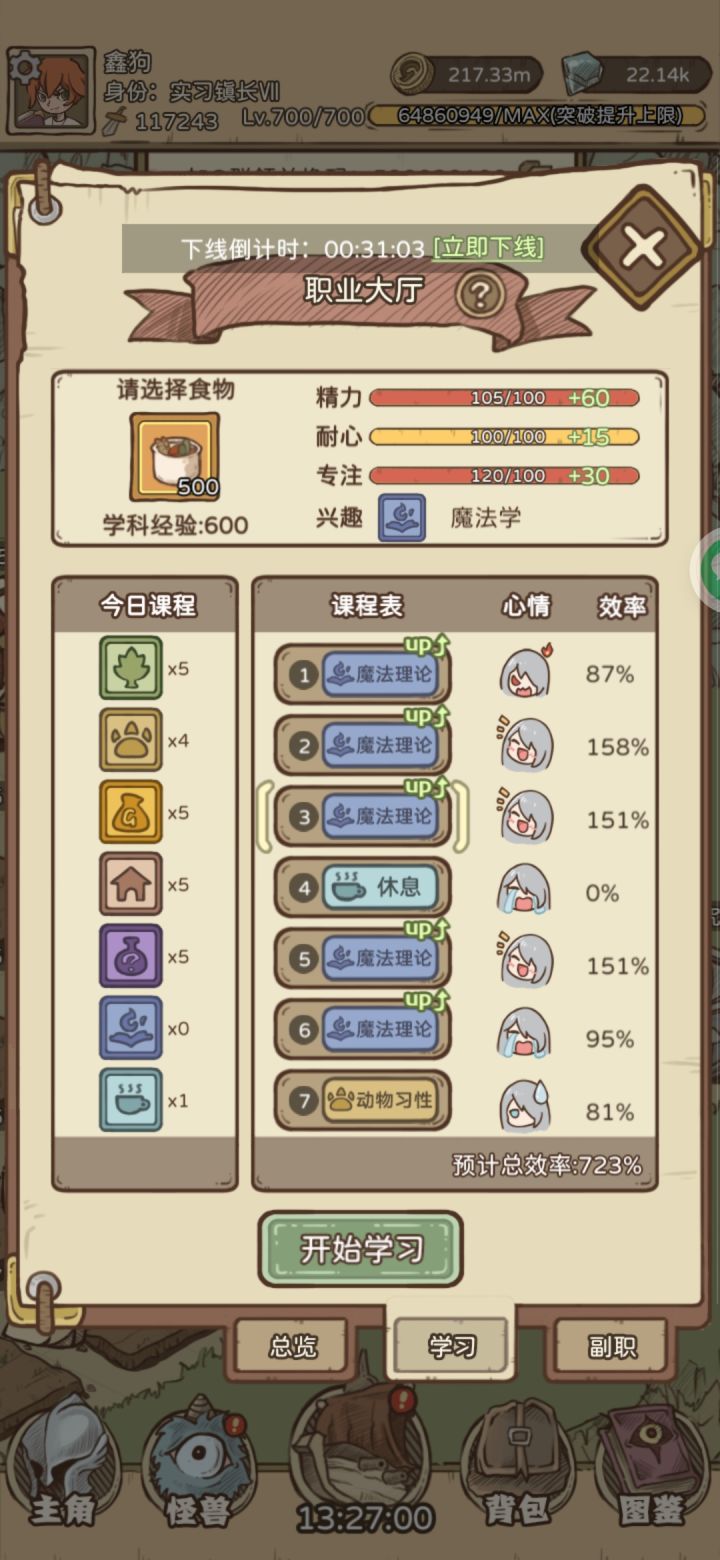 2023年7月6日职业大厅为所有服同步精力/耐力/专注每日刷新新版本优先魔法学800,其次自选看一次广告以后,随意选择,直接看图(如下图)。今日最优食物选择:海鲜虫草汤(套餐C) 今日四暴击(专注) 今日周四休息(推荐) 玩法说明1.每天有1次学习的机会。2.学习之前需要设定食物与兴趣学科,每次只能设定1种料理和1门学科。3.设置后,可根据课程内容按自己想法安排课程或者休息