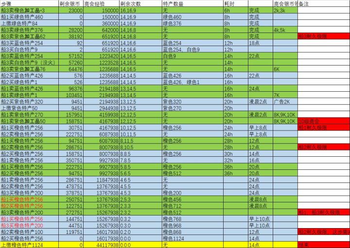 2023年4月10日更新本活动玩法对游戏内本身的影响很小,所以怎么开心怎么玩儿就行航海最主要的就是:1.先用租的船跑三次,直到耗尽耐力,一艘自己的船也能轻松20级商会。2.加工品不需要带火苗🔥也可以出售,航海币一样多,但是特产就必须带火苗🔥3.下图为双船跑法,思路是不变的航海玩法:上图为区域划分,每个玩家会被随机分配到各区域,售卖货物尽量选择就近原则,保证高价,价格越高越好,颜色越高