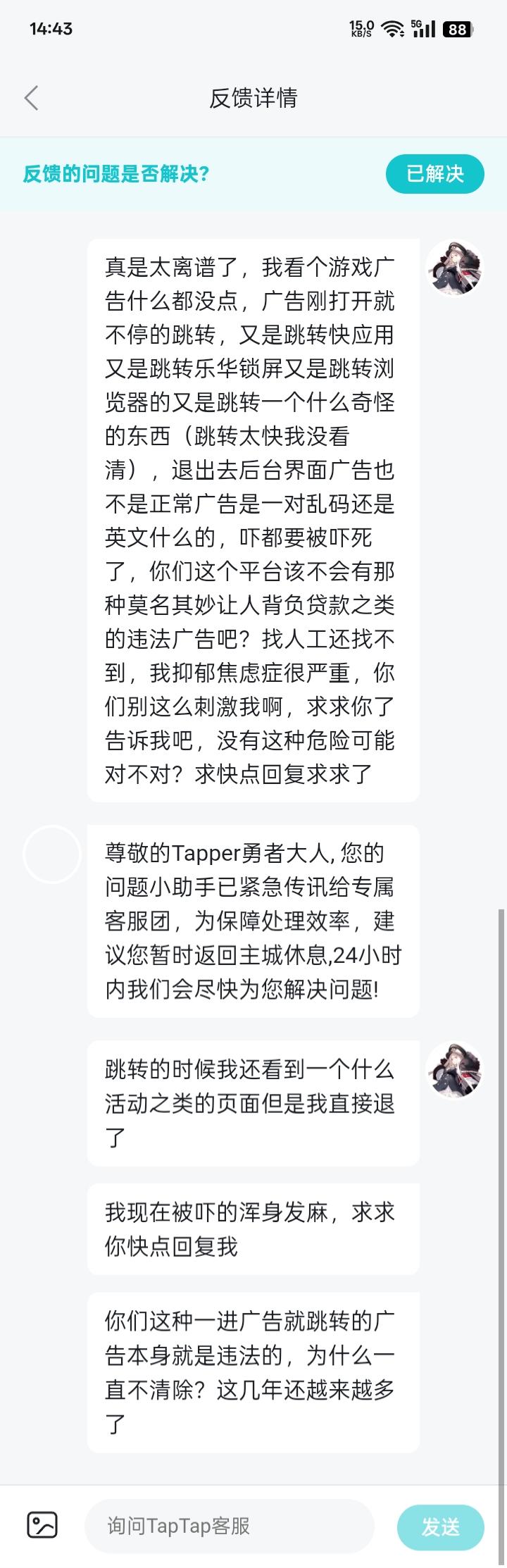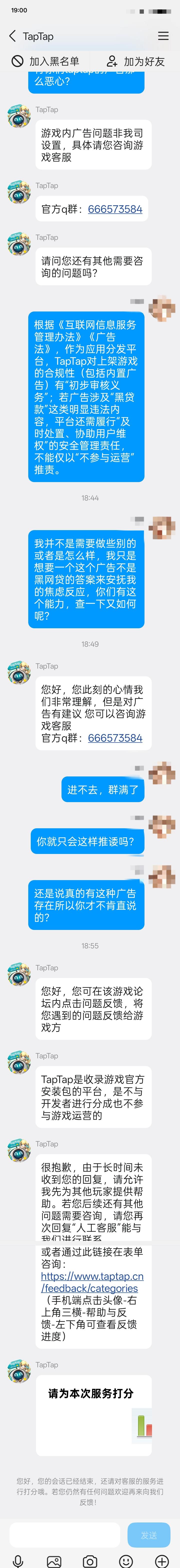我因为过于悲观,一遇到这种突然跳转多次的广告就会胡思乱想觉得会不会是非常可怕的结果,比如黑网贷什么的,结果tap不管,你们也不回话,群也进不去,如果这个广告真的有问题,那么谁来负责?没有人能给我一个回答吗?