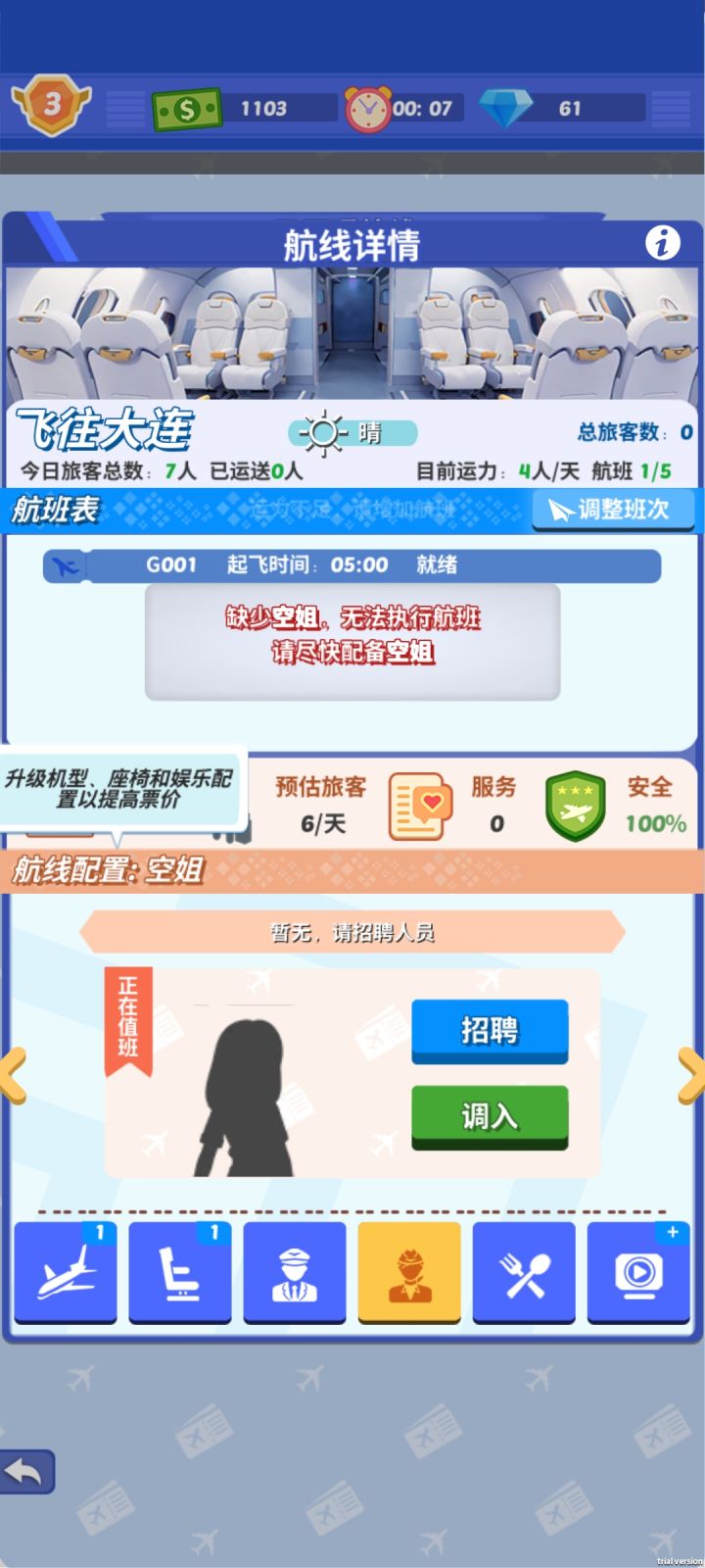 招聘机制太逆天了,看一个30秒广告,花30钻石,结果招到一个自己的员工,还只返还一个经验书,是没有太多的角色模型了吗?,机场买票 安检 登机 这些都符合常理,为什么招聘会招到自己已经录用的员工,反过来说,招聘是双向的,你不投简历就不会被招录,员工都已经被录用了,他为什么还要投简历?这不是钻牛角尖,我是觉得机场主线游戏都很符合常理,就这一个逆天机制格格不入。另一个小问题,