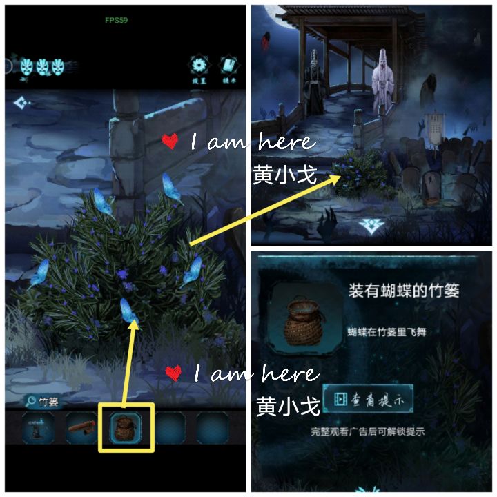 第四章:水中月1.(奈何桥)点击草丛,用【竹篓】装蝴蝶,获得【装有蝴蝶的竹篓】2.(鬼门关-右)拿【装有蝴蝶的竹篓】给人,获得【镰刀】,拿【银元宝】给人,获得【熏香炉】3.(奈何桥)点击草丛,用【镰刀】割得【迷迭香】4.(棺材铺)点击箱子旁边的杵臼,放入【迷迭香】研磨,获得【迷迭香粉】5.(鬼门关-左)点击石柱上的架子,放上【长明灯】和【熏香炉】6.打开香炉的盖子,倒入【迷迭香粉】7