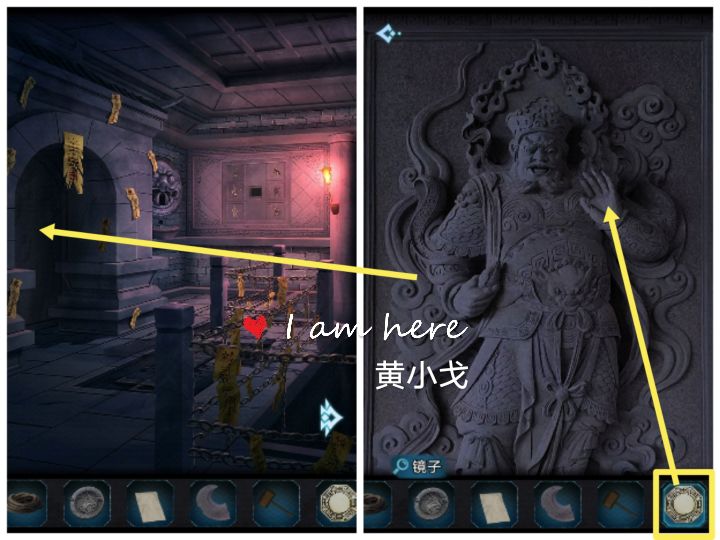 第三章:平阳落1.(石窟2-场景1)点击左边暗门上的雕像,把【镜子】放入雕像的手中2.点击照在地上的光,获得图案顺序线索3.点击地上的机关,放入【石砖】,查看游戏说明,完成推箱子小游戏4.暗格打开,获得【古钱币】和【纸钱】5.(石窟2-场景2)点击石台,根据左边光照图案顺序线索,调整石块的位置,左边的暗门打开6.(石窟2-左边暗房)点击空地,获得【竹篮】7.(石窟2-右边暗房)点击石