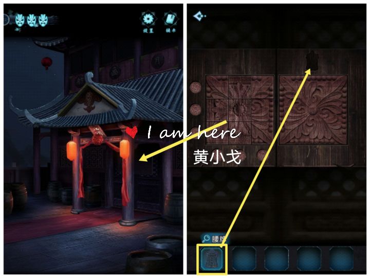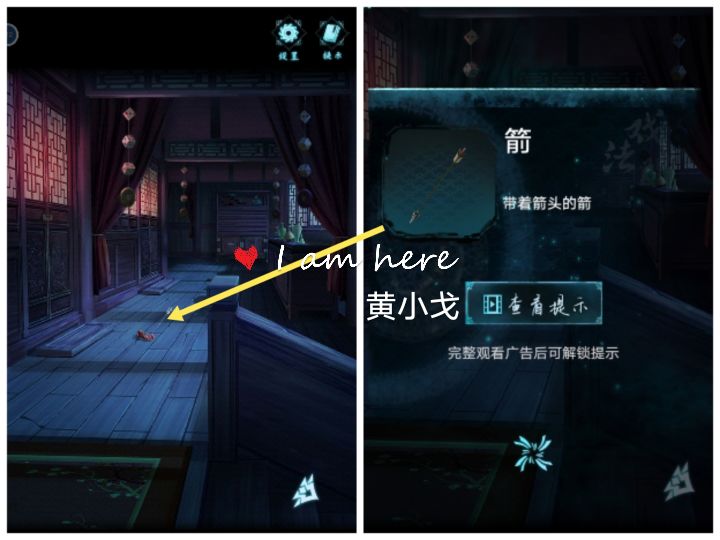 第二章:昔日景1.(二楼走廊)在绣花鞋上获得【箭】2.点击左边房间的门,用【钥匙】打开3.(二楼-左边房间)点击地上的投壶,使用【箭】,查看游戏说明,完成小游戏4.暗格打开,获得【玉貔貅】5.点击柜子,打开右边柜门,获得【一枚钱币】(注意看柜门上的线索)6.点击衣柜上的机关,放入【一枚铜钱】和【一枚钱币】7.根据柜门上的线索(钱币的样式及连接的点数),调整钱币的位置8.衣柜打开,点