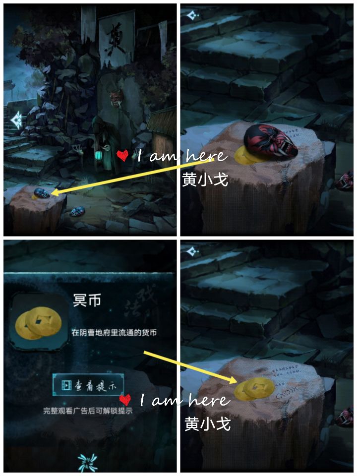 第四章:水中月(孟门渡-药法门)1.(鬼门关-右)点击桌子,在面具下面获得【冥币】2.点击查看桌布上的线索(左右左左右右右左)3.点击告示牌,获得线索(元宝=香炉、手杖=火折子、五只蝴蝶🦋=镰刀)(注意幡上有一个奠字)4.(奈何桥)点击墓碑群,获得【小青灯-右】5.查看幡上的线索(注意看牌位上有一个奠字)6.点击木盒,注意看木盒上的字(人生三大悲:怨憎会、爱别离、求不得)7.点击黑