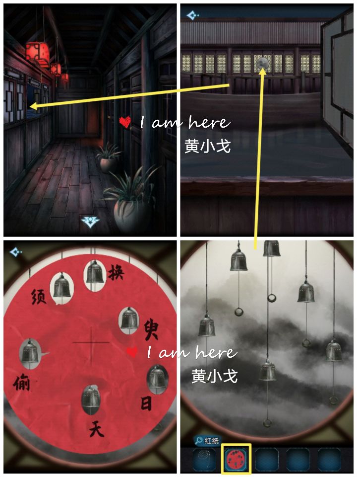 第五章:旧尘缘1.(走廊)点击窗户,点击对面圆形的东西,对风铃使用【红纸】,获得线索(风铃响的顺序:换、日、须、臾、偷、天)2.点击右边房间门上的锁,根据风铃响的顺序(换、日、须、臾、偷、天),调整密码锁(要看中间的十字符号,看字在符号的哪个位置:就比如换在十字符号上方),打开门3.(右边房间)点击查看地上的书4.点击墙上的机关,查看游戏说明,完成小游戏5.暗格打开,获得【黑布】和【手鼓