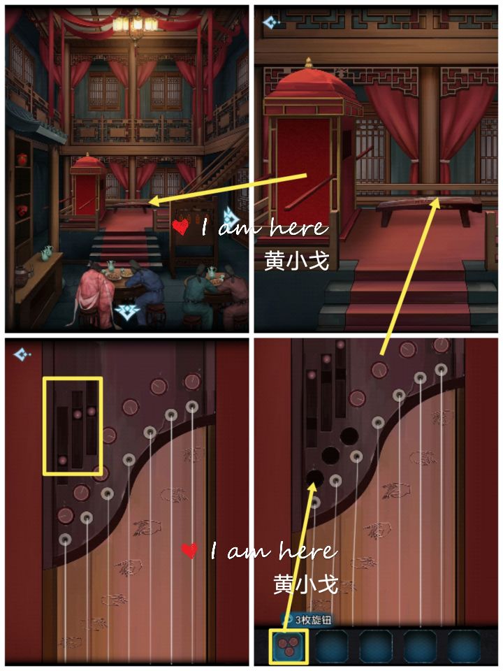 第一章:戏法师1.(酒楼大厅)点击古筝,放入【3枚旋钮】,点击旋钮,把珠子放入凹槽2.根据琴谱的线索(红点数及对应的手势),结合古筝上的手势,弹古筝(7426513),触发剧情3.(侧厅)点击楼梯,上二楼4.(二楼走廊尽头)点击柜子,调整上面的机关(根据小圆块上面的图案把罩子盖到对应的图案上)5.柜子打开,获得【木挑】6.点击墙上放房牌的地方,使用【木挑】,第一个牌子不能动,注意观察规