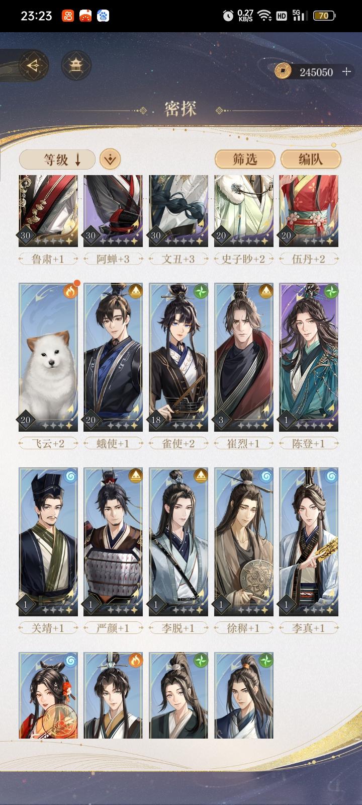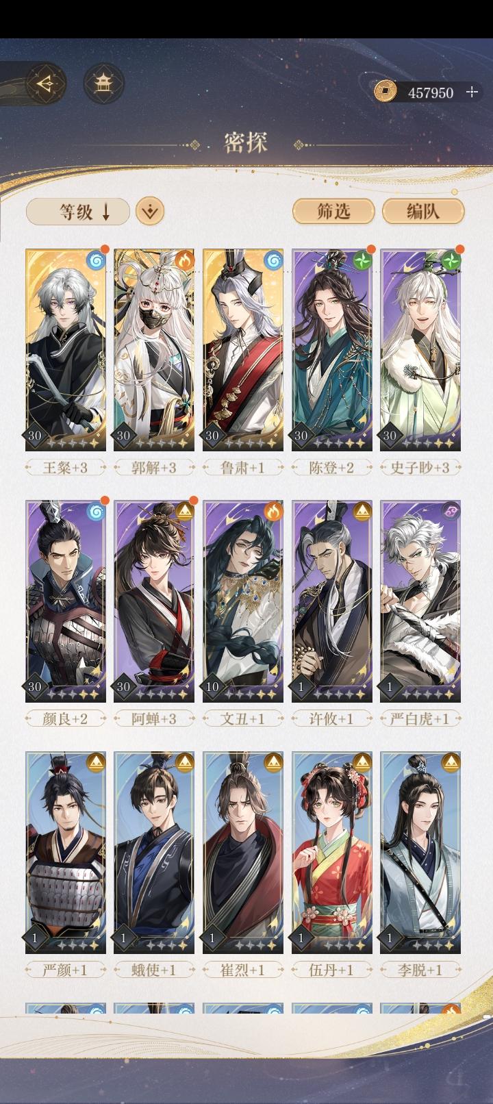 一有空就去据点搞资源,钱不不要,密探升级材料,尤其是高级的要多多获取,后面升级密探很费。观星设置自动溶解绿色白色,这俩都没啥用的,主养紫色,有钱就去抽橙色。每天多去摸摸拍拍老公,有家具可以换,这个很实惠。前期攻击主要养婵,打不过的时候记得用好颜良。