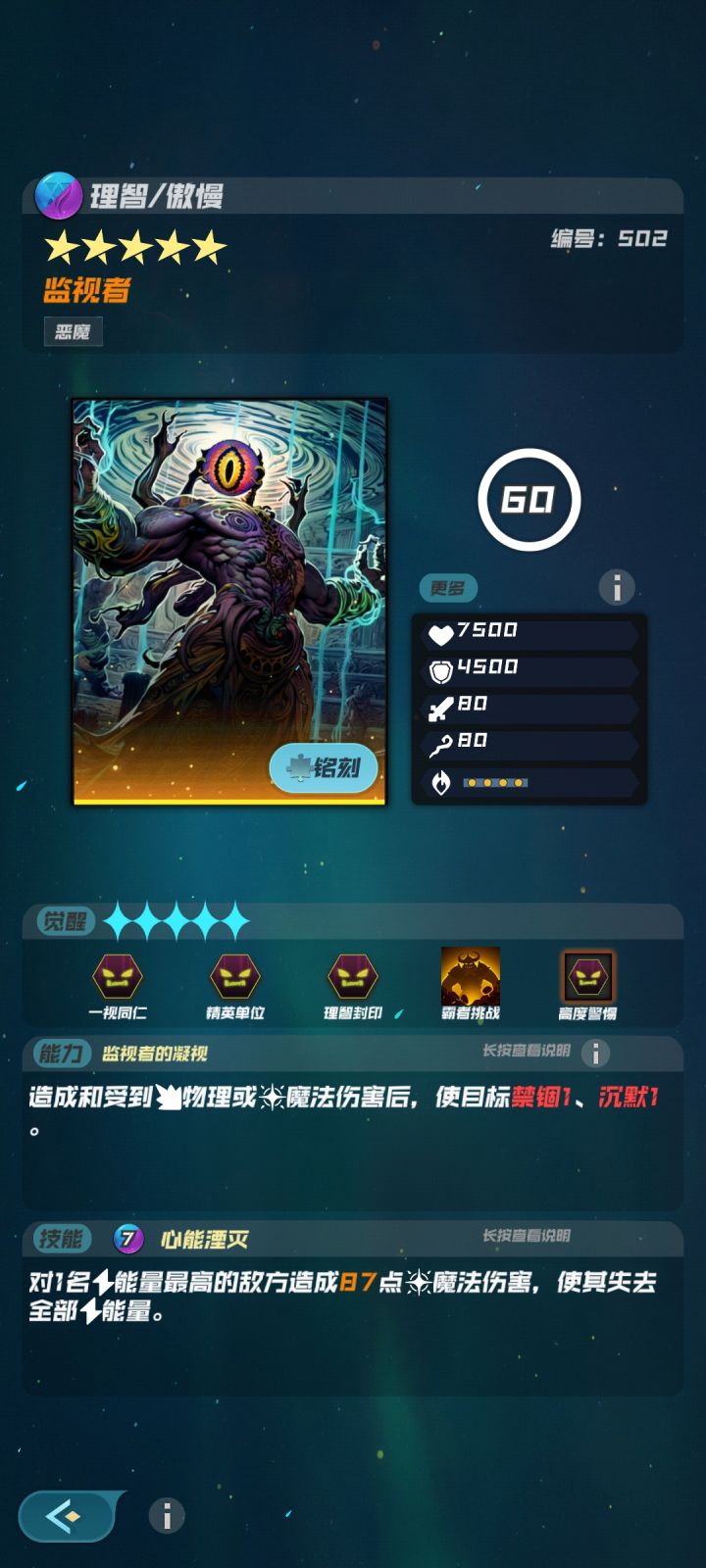 每次环境更新,就是新赛季的开始。这游戏环境更新比较频繁,队伍更迭也比较快,新人随时入坑都不晚。阅读提醒:1.本文分享的阵容仅针对当前版本,当此帖被你看到时已成明日黄花,可以选择绕道。2.本文分享的阵容需要氪金卡,0氪可以选择绕道。3.本文分享的打法根据本人卡库设计,请勿生搬硬套。4.本文分享的打法并非最优,目的是抛砖引玉。本帖分享一种“监视者”霸者的打法。一、霸者简介霸者:监视者