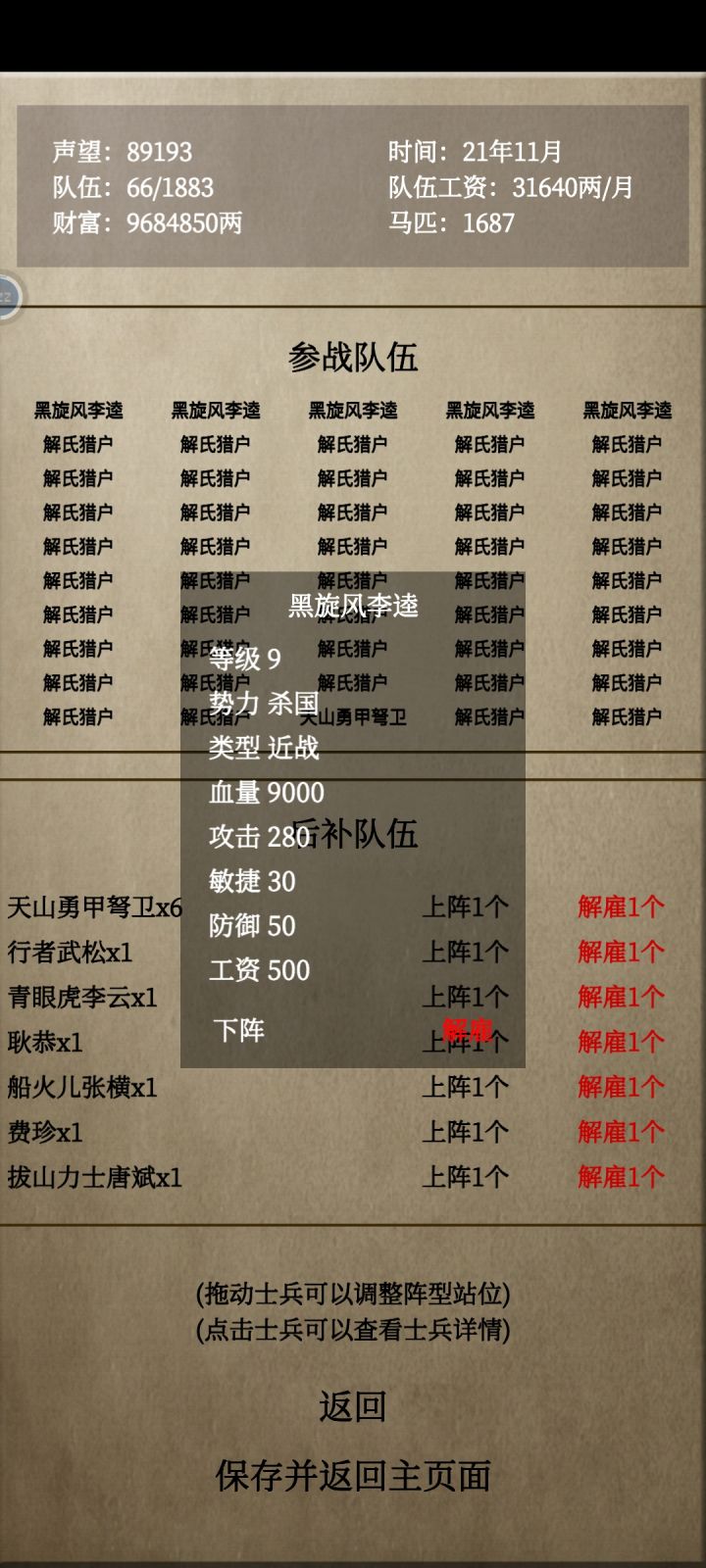 PS:抓特定武将点战争 选择国家 遭遇战,就可以抓这个国家的特定武将了和专有兵种了开局:选吴用,敌方全体防御-5最好的天赋国家:除了梁山(有9级肉盾关胜) 赵国(10级远程轰天雷凌振) 蜀国(9级远程公孙胜 9级闪避怪戴宗)都可以选进入游戏直接看10次奇遇招募广告。一排有英雄放英雄没英雄放8级骑兵,二排放后备骑兵或者投掷兵。后面全部放骑射或者远程兵,然后直接攻打梁山(英雄属性比较好还有5