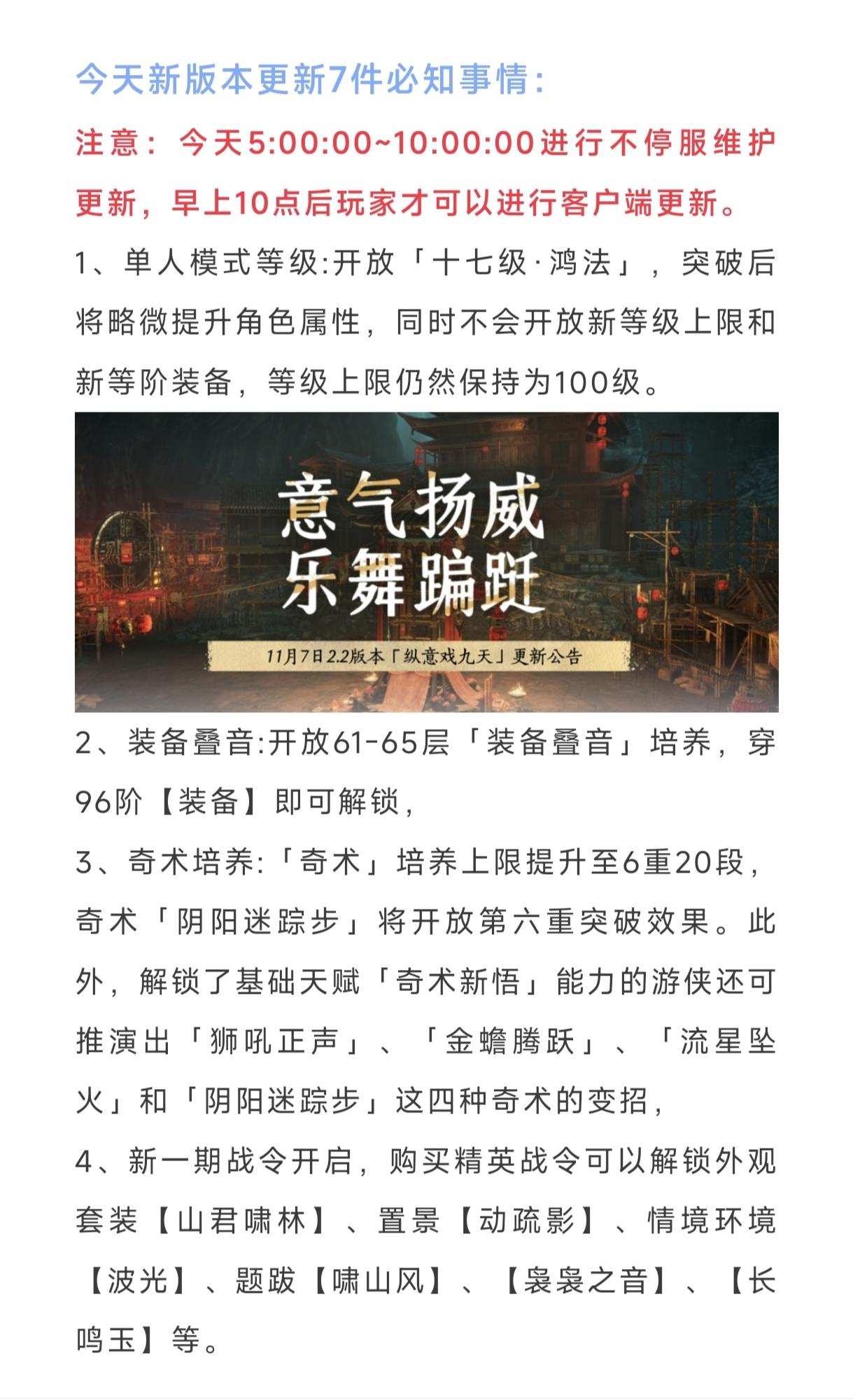 燕云十六声今天新版本更新8件必知事情,单人模式等级开放十七级·鸿法,装备叠音开放61-65层,奇术培养上限提升至6重20段,开放基础天赋新等级培养。开放梨园地位系统戏班,开放梨园门规系统、开放九流门驻地探索,开启猫之行活动,#游戏种草计划 #燕云十六声 #燕云十六声攻略 #游戏推荐 #游戏日常