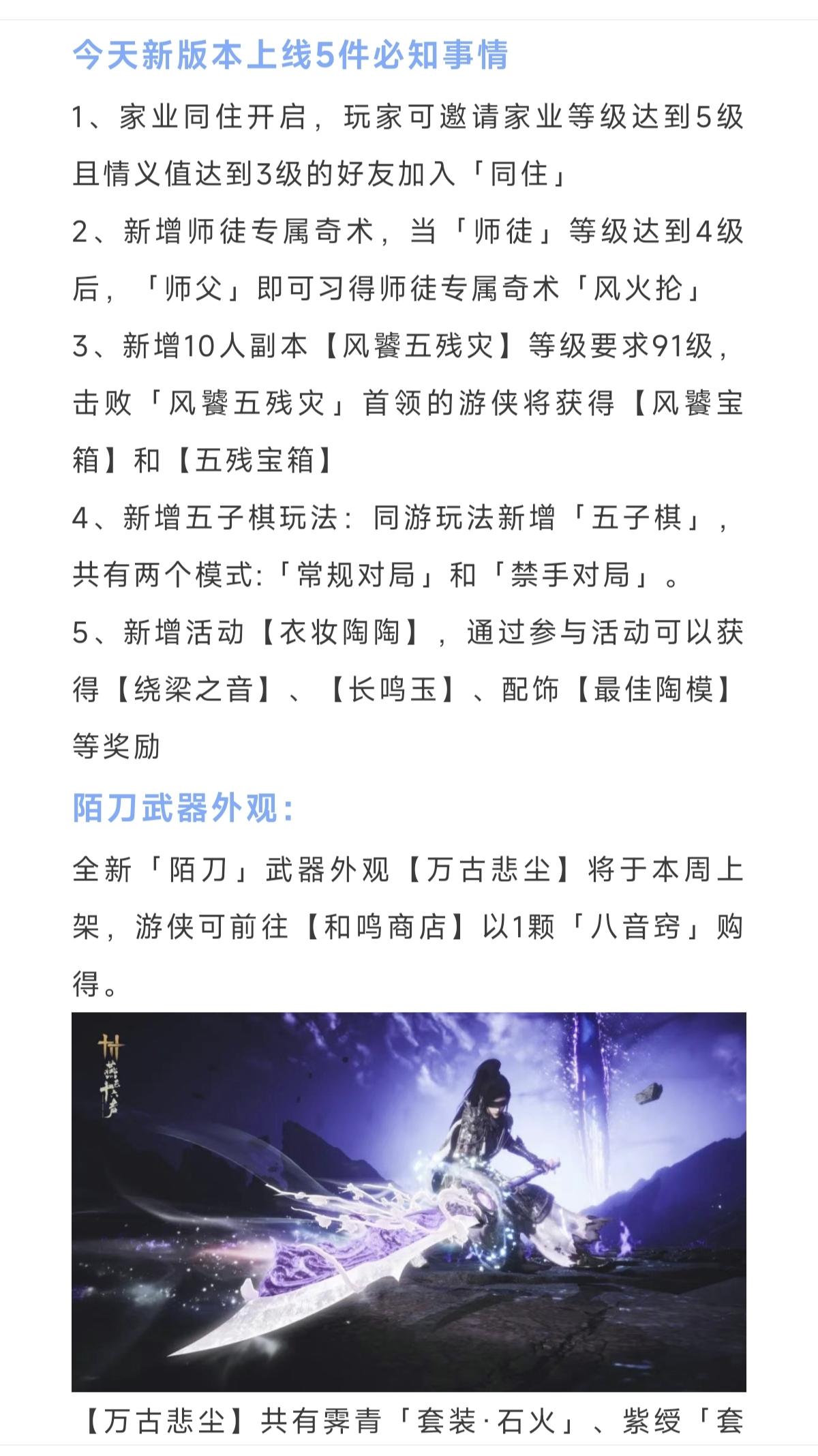燕云十六声今天新版本上线5件必知事情,新增师徒专属奇术风火抡,开放家业同住功能,新增10人副本风饕五残灾,新增五子棋玩法,新增活动衣妆陶陶#游戏种草计划 #燕云十六声 #燕云十六声攻略 #游戏推荐 #游戏日常