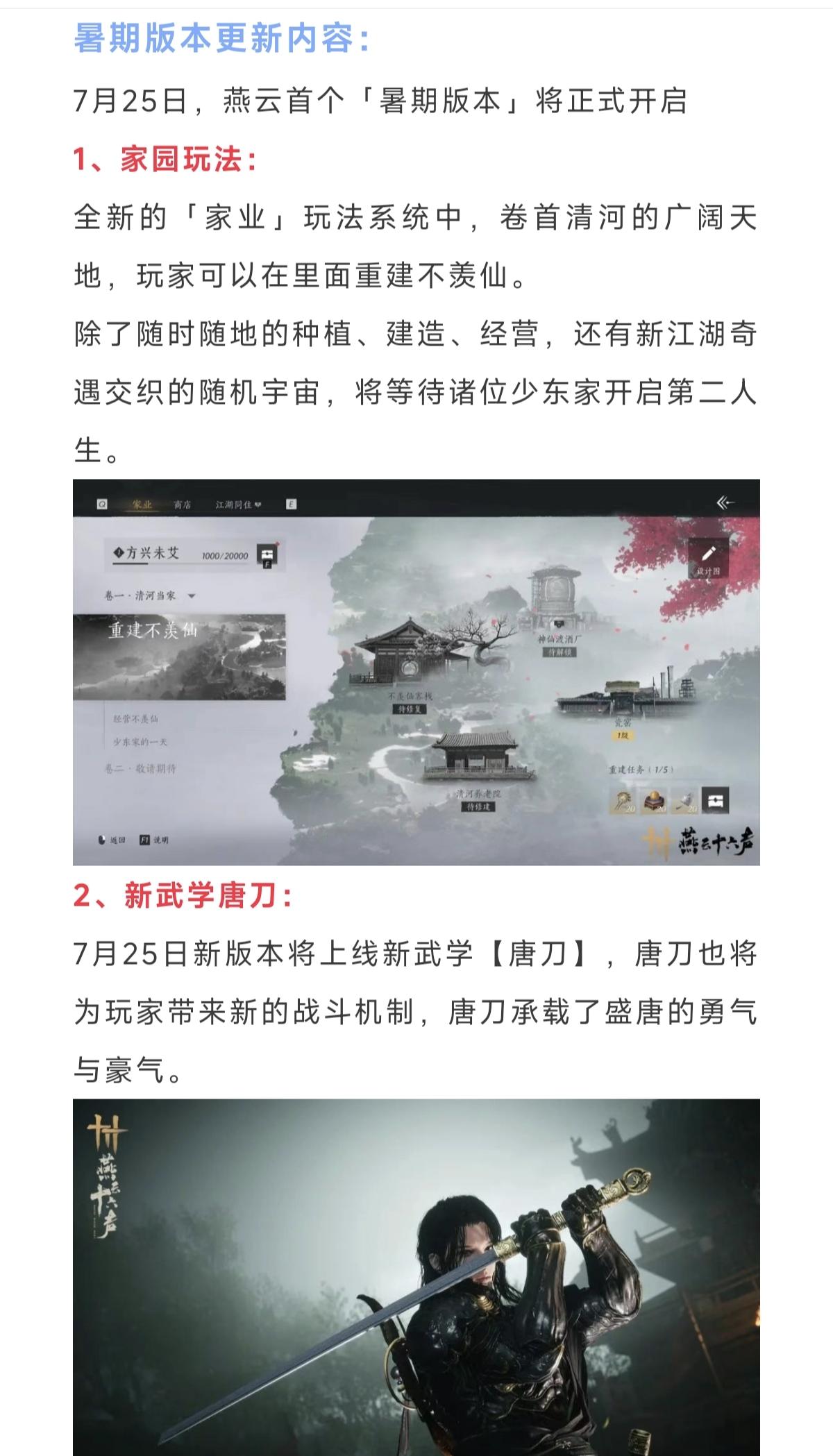 燕云十六声7月25日新增5个小时不羡仙剧情,家业玩法