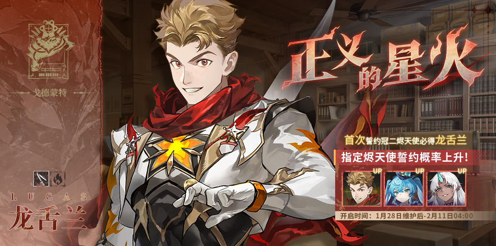「正义的星火」、「荒野无枪日」限时誓约即将开启烬天使:龙舌兰武魂:沙海炽阳誓约时间:1月28日维护后-2月11日04:00誓约说明:活动期间【正义的星火】限时誓约开启,该誓约中以下烬天使获得概率提升:冠二:龙舌兰(首次获得冠二烬天使必得龙舌兰)冠一:格蕾丝、锡蒙利(占冠一出率的50%)活动期间【荒野无枪日】限时誓约开启,该誓约中以下武魂获得概率提升:冠二:沙海炽阳(首次获得冠二武
