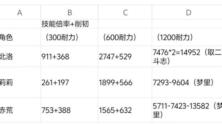 字多可以直接看图;①北洛;北洛强度不用多说,这里只是列出她的数值,好方便对比下列原始人;一技能:300耐力,911的倍率和368的削韧,需要注意的是两段,优势是瞬发(好上手)带位移,缺点是贴脸不好放,但可以通过闪避取消位移;二技能:共计600耐力2747倍率和529削韧,优点显而易见,优点是回心流快、数值怪、带浮空,缺点是需要把握攻击距离和时机,避免打到空气,同时我们以这个数值作为普通技能