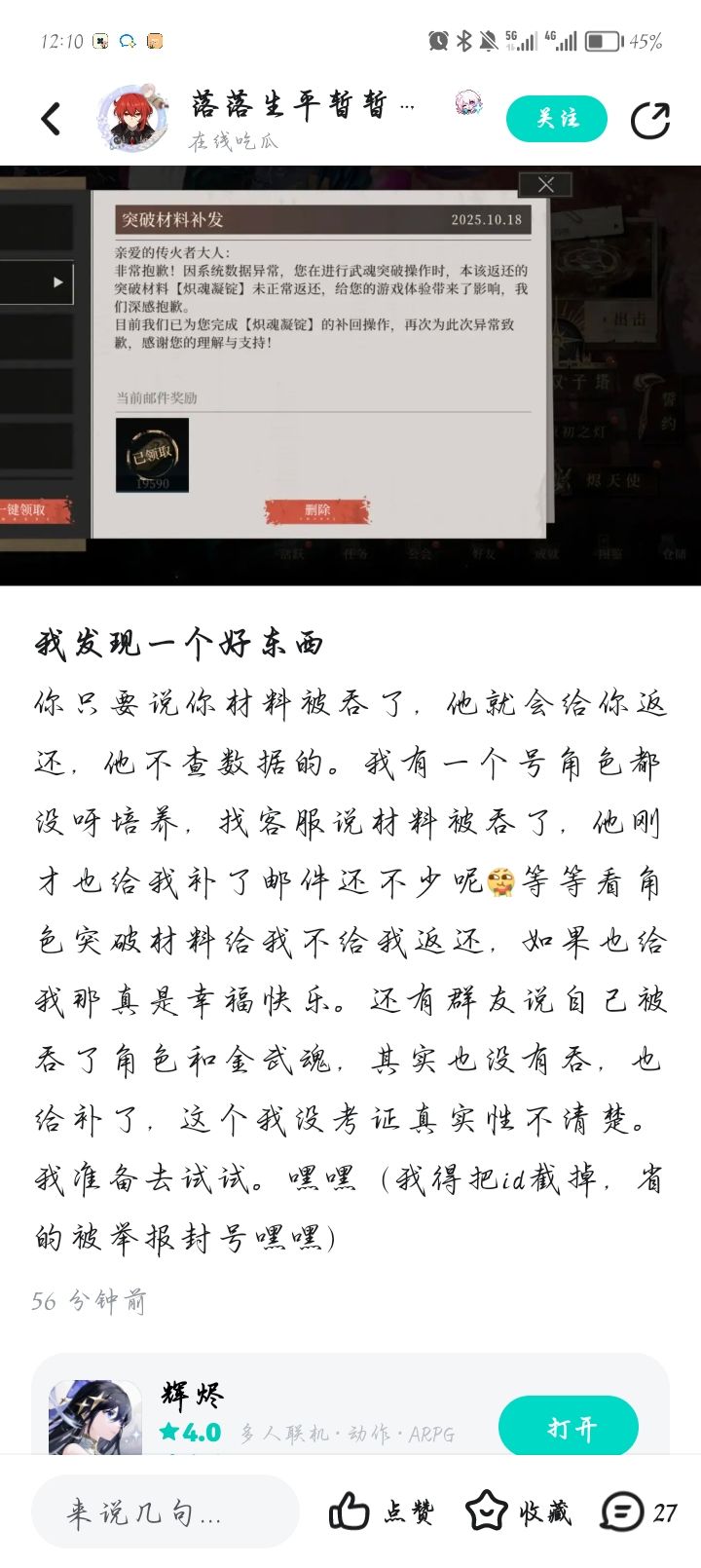 昨天我还在夸你,今天看到一些东西真的憋不住了(图二三)一堆人反馈我目前看到的总结如下1.邮箱号封几个压压声,大多数没封没回档有的重复二三十次都没事你游这么看还是想死了一开始以为都是十次内没事大家拉的不多三十多次也没事是吧?你游戏还有人愿意氪一分钱吗2.跟客服反馈吞材料了根本没办法核实直接全部返还是吧,好好好,这个比上面那个还让我不接受,你们这是什么草台班子?昨天还在因为游戏内整体