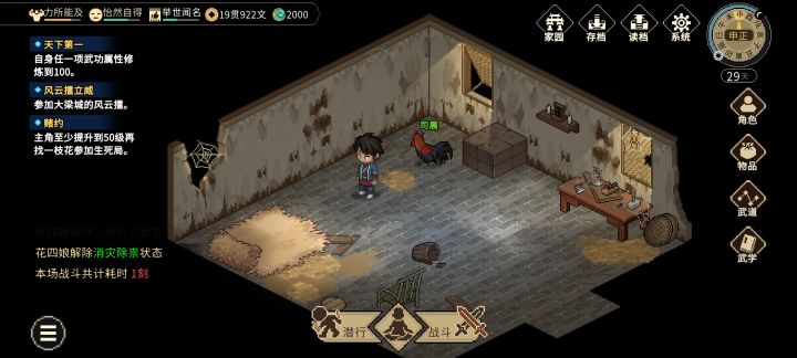 推荐第一次玩的新手选择拳开局(比较友好),当然,想玩别的也可以,但需要晚一点才能加入对应宗门。粗茶是送白头翁的,胭脂送花四娘,送礼物能提高关系,达标后能触发心愿任务,完成可以邀请对方加入队伍。注意:迷踪林里面有几个支线,可以看着做一下。回去破庙交付任务,捕快会让你三天后再来,这时候就可以去无名小村探索了。如果开局选的是拳,这个功法就能用很长一段时间,性价比极高!进入无名小村后,支线剧情就