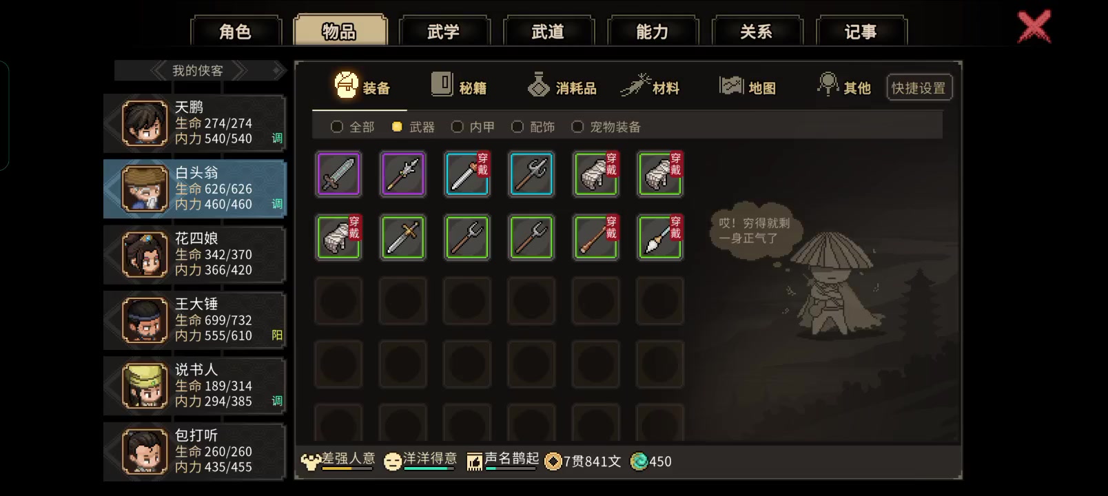 退出地图后无法更换武器,点击武器无反应。可以正常卸下武器。#大侠立志传