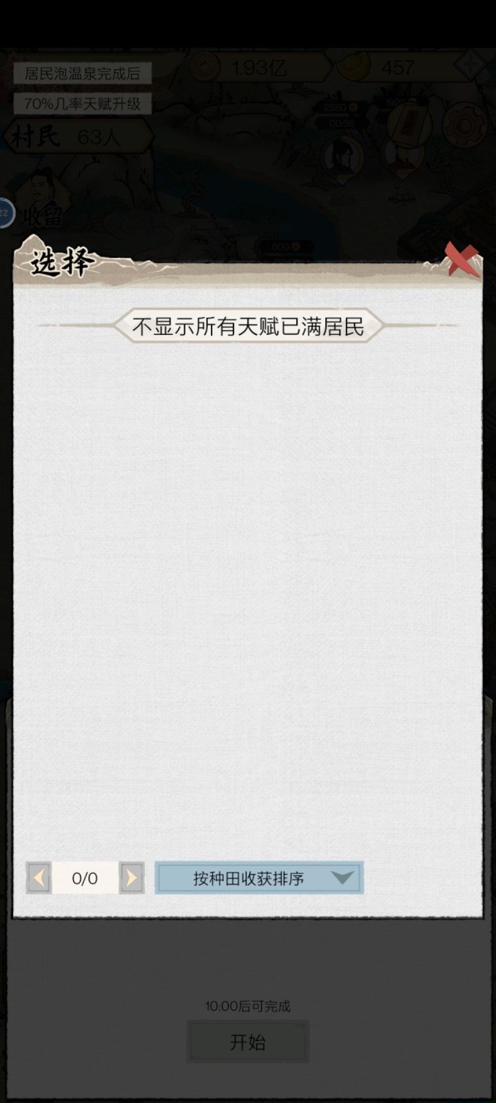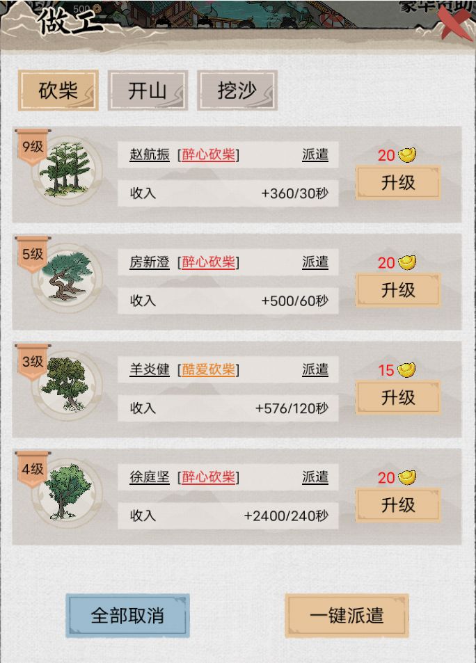 目前,繁荣度顶级,温泉顶级,寺庙顶级,所有建筑顶级,已经算是通关了前期花了太多元宝在挑选工人上,通关之后,才发现游戏玩错了,游戏的正确玩法:先招录砍柴、开山、挖沙的工人,先把这个刷满,全都刷到红色其他类型的工人没什么用,只有砍柴、开山、挖沙的工人和建筑升的越高,离线收益也就越高,最后等着挂机通关就行