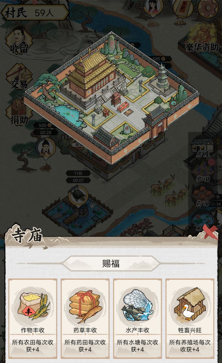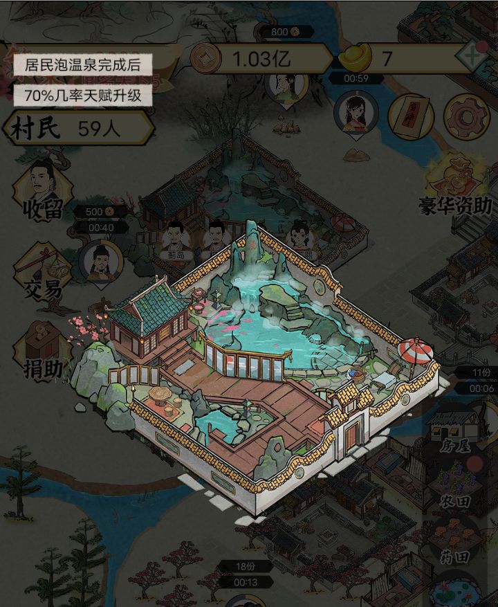 玩了一会儿,目前繁荣2765,提供一点快速赚钱的方法。元宝使用:在线一定时间即可领取元宝,左下角的事件也有几率奖励元宝。没开温泉的时候元宝优先套圈,开温泉之后元宝直接怼到温泉升级上。有富裕的元宝可以升级挖沙开山砍柴这三个,挖沙的收益高于开山高于砍柴。优先级:温泉>寺庙>套圈>其他不要用元宝刷新居民天赋!不要用元宝刷新居民天赋!非常浪费!后面用温泉池升就是了。我硬生生刷了三十多元宝都没