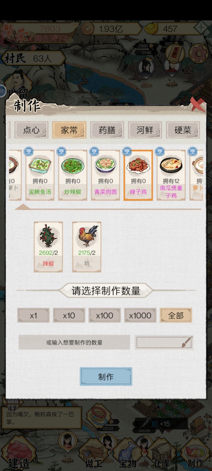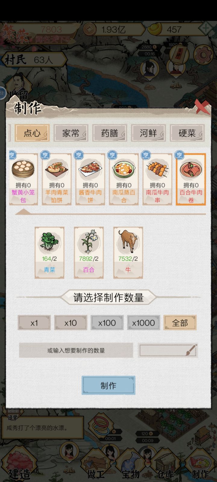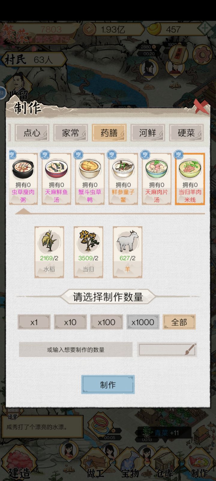 第一天晚上交易的食材刷出高价格的当归羊肉米线、百合牛肉卷、辣子鸡中的一种(主要多种食材而且数量一致),升级好加工设施,开着手机过夜💤。第二天一早就会发现买完菜后铜钱爆棚,一下全部升满了。四天时间,所有居民天赋全满。