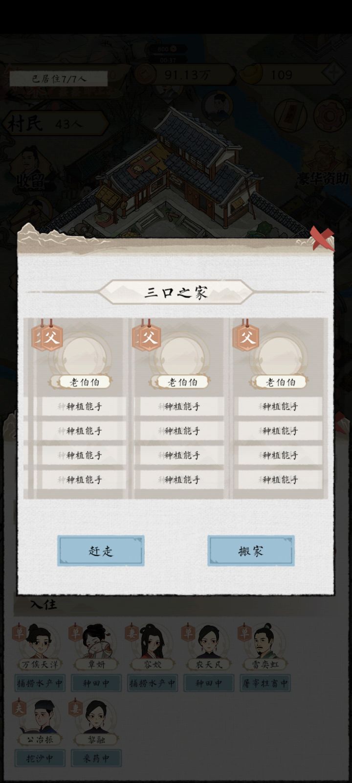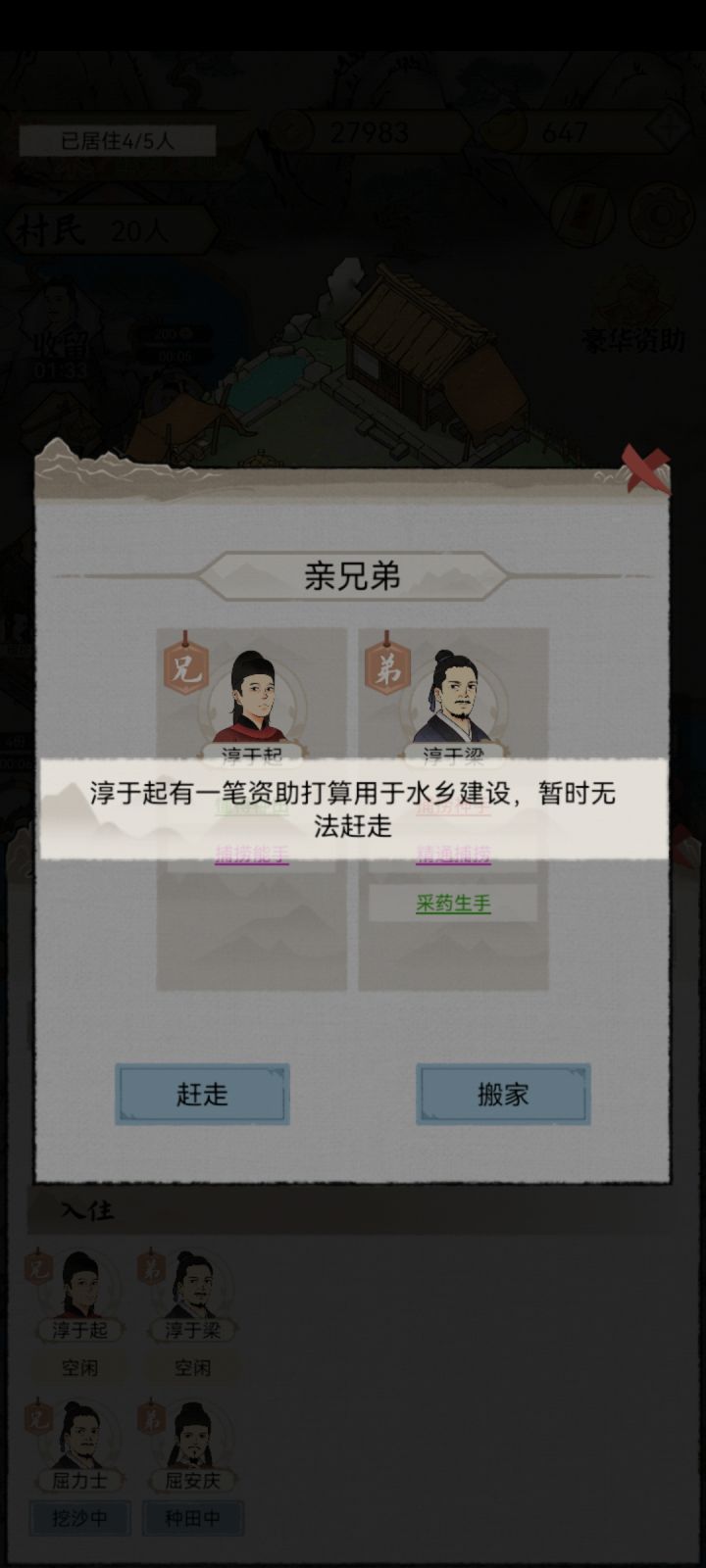 不是他们为什么赶不走啊?我把捐款收了马上就去赶走,又显示已经在资助了,反反复复好几回就是赶不走所有人都能赶走,怎么就这两兄弟是赶不走的??这是什么bug吗?这两兄弟要是赶不走我很难受只能重开了啊