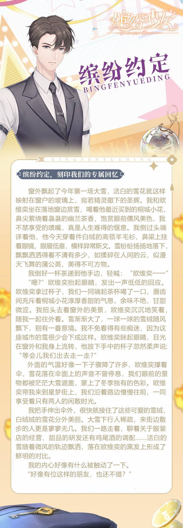 宝贝们好呀!ヽ(^ω^)ノ欢迎来到第一期【缤纷约定】小剧场,今天带来的是“我”家奢侈品店顾问「欧维奕」小剧场——刻印我们的专属回忆。他清冷的眸光中隐隐透着贵族般高傲的气息...有着与年龄不相符的沉稳气质与独到品味,不禁令人好奇他的出身和阅历...来看看“我”与欧维奕的相遇会发生怎样的故事吧~