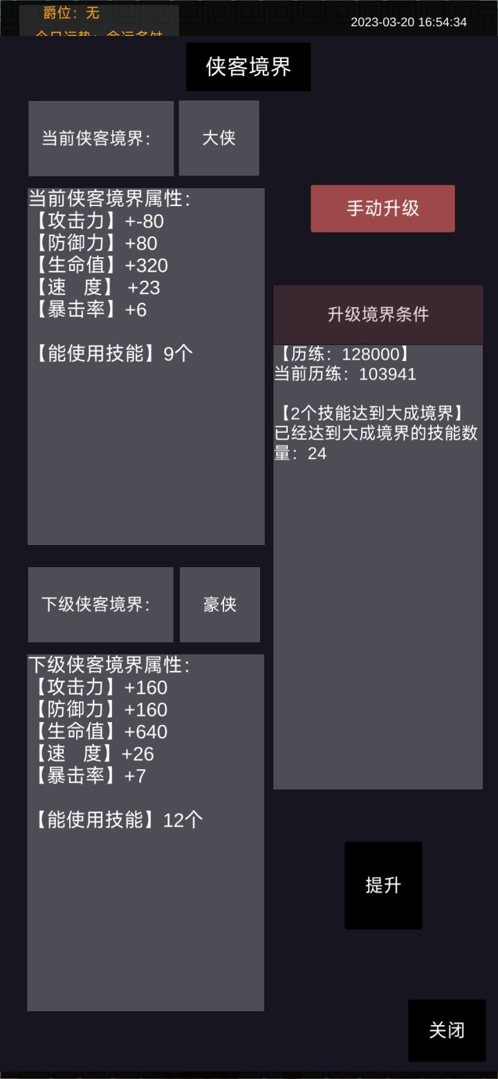 版本1.803反馈:这个单机,大侠境界出现负80。无技能,无装备,只有经脉提升2%攻击力。未升级到豪侠,后面不知道会修正好不!一个未修炼到宗师的攻略:注册一个网络版为大号,单机版为小号。第1步,领礼包,2022165 exp expexp dzexp money equips。第2步,进柳家堡如下1. 史诗 2. 武皇 3 元楚 4 金 5 肖枫 6 铁齿门 7 丙 8 丙 9. 丙 1