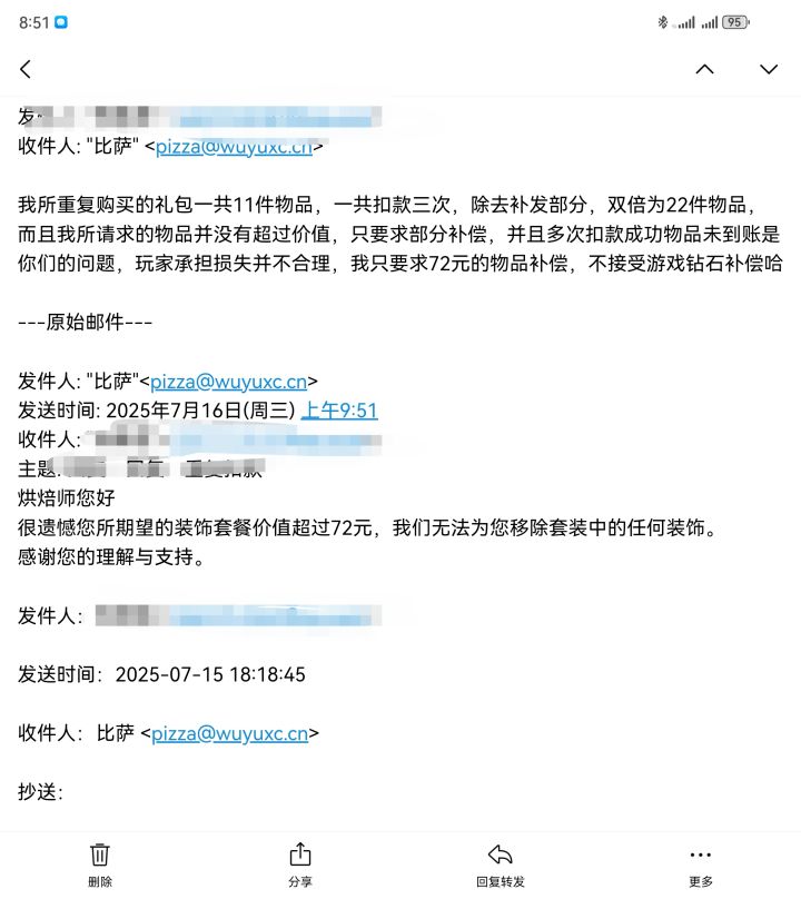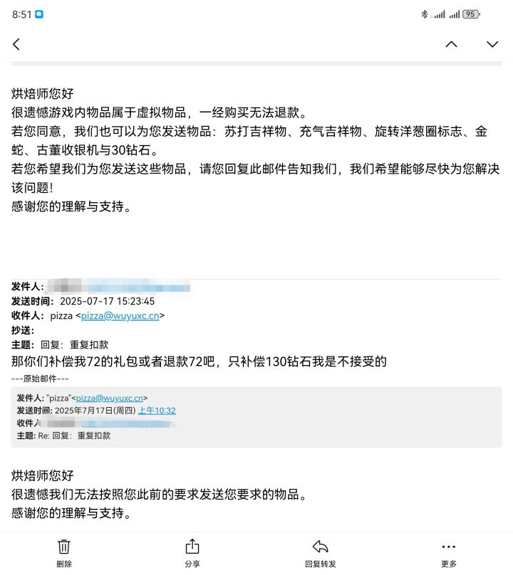 36元限时礼包,扣款108,甚至礼包未到账,还是发邮件申诉后才补发了礼包,然后剩下差的72我申请补偿,跟我说补偿130钻石,我拒绝了,然后申请了同等礼包物品,给我说不能补,我说不然就申请退款,说不能退然后说要给我补偿那种不限时的上古时代的几个破物品我再次拒绝,然后官方回复这是所有方案,什么意思,意思是不接受就白花钱是吗,官方你自己看着不好笑吗,我购买的限时礼包申请同期限时礼包补偿(我购买的礼包11