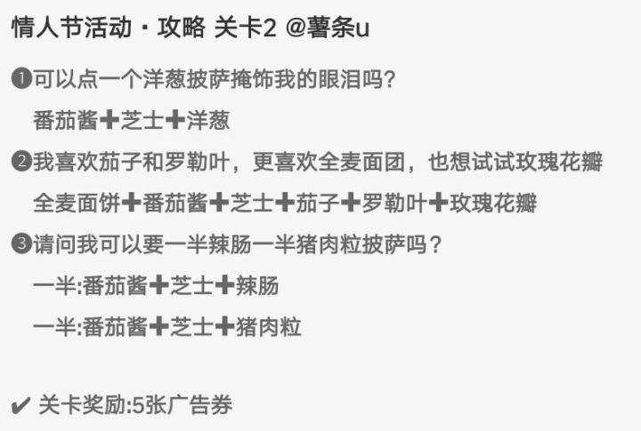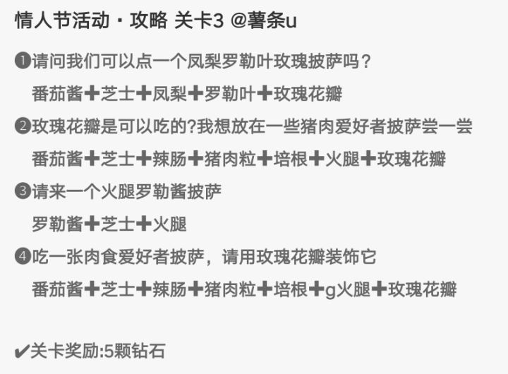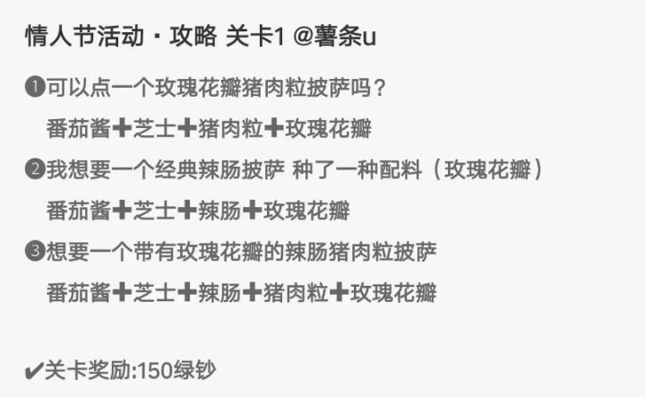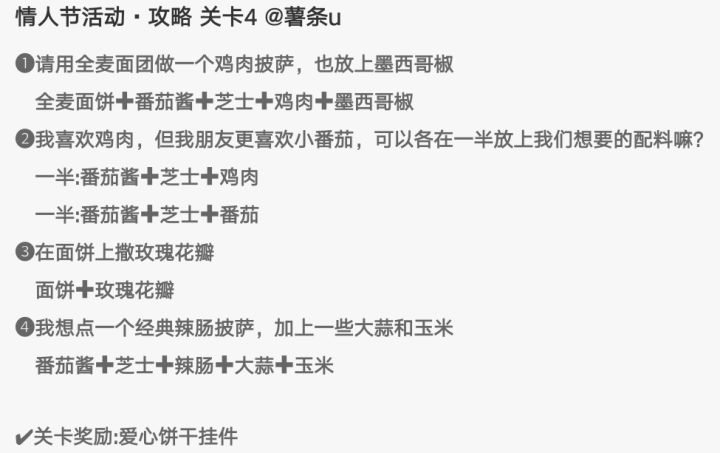 1.建议看攻略,提前背一点,找靠谱的攻略,很多都有错误,提前看评论区有没有纠错的!一定要找正确的,不然需要花2钻石重新来,第二次4钻石2.把增加好感度和烤箱加速都用上3.水果披萨和蔬菜披萨需要格外上心!水果有八个,蔬菜是五个加上玫瑰花瓣,数一下少没少4.一个活动点需要半小时恢复,全部(50)活动点25个小时就恢复满了,把握好这个时间大概就是这些5.做的时候放平心态,完成时间很充裕,有时候