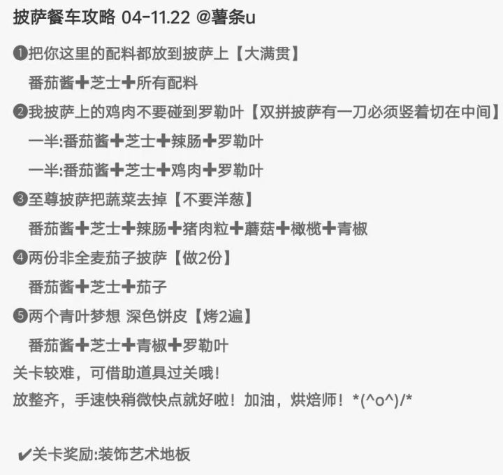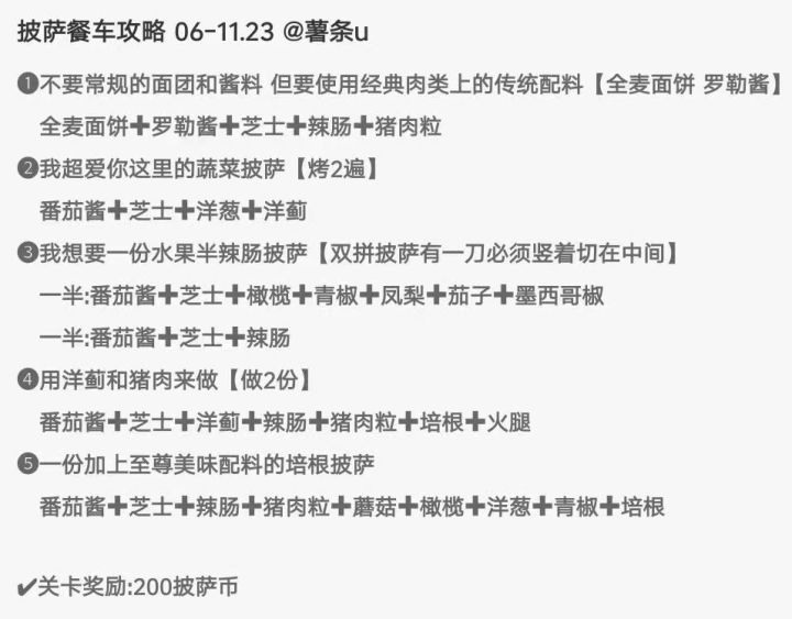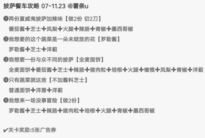 芝士酱料都是默认加的,不加和换酱之类的会标注。实时更新第一关:牛油果芝芝肉香=牛油果+辣肠+猪肉粒第二关:辣披萨上有柔软绿色水果=辣肠+牛油果芝芝牛油果=牛油果第三关:无难点,基本都描述清晰。第四关:难点在于纯手工放,但是描述都还算清楚所以过了。第五关:带肉深皮=除了鱼之外的肉类(辣肠、猪肉粒、培根、火腿、鸡肉)+双烤面饼哼哼肉牛油果=猪肉爱好者+牛油果+无酱料芝士不想