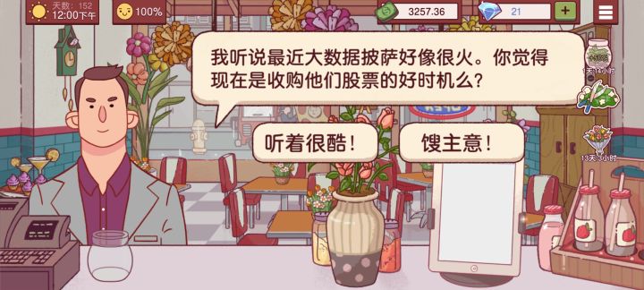 价格战,怎么省钱第四章就有了自种蔬菜了,在前期时间长很难得到,但是价格战里根据新闻提示,你选择广告会有“只用自种菜”这一个选项,可以少赔点。那么如果自种菜不够或者没有怎么办?就不要管顾客的点菜,时间会继续走完,你可以通过外卖赚点,这样就不会顾客点了你又没有来回折腾并且还浪费材料。