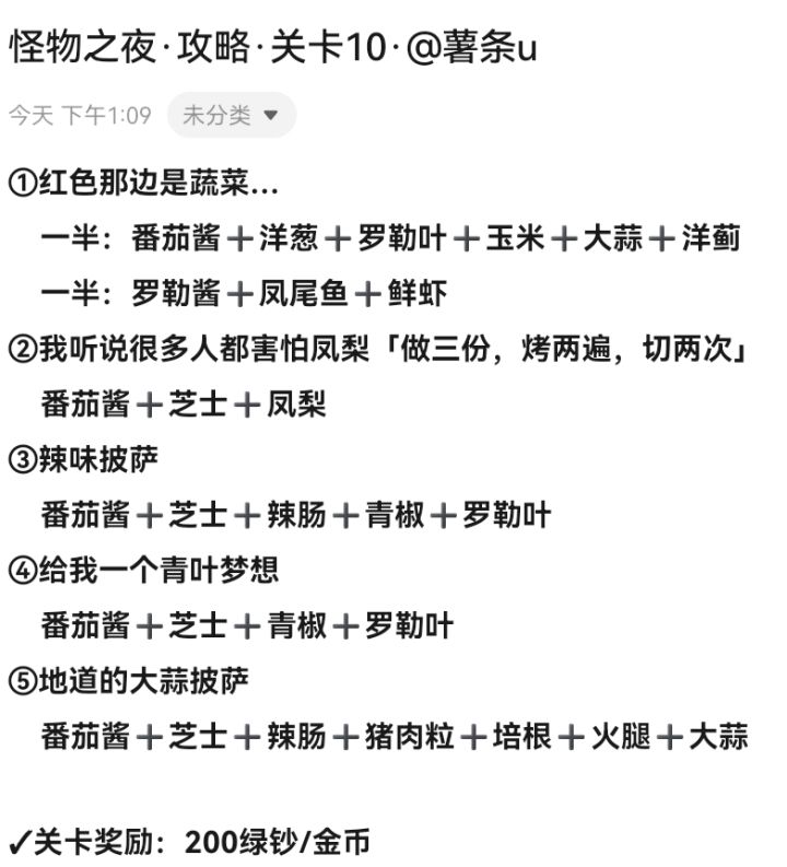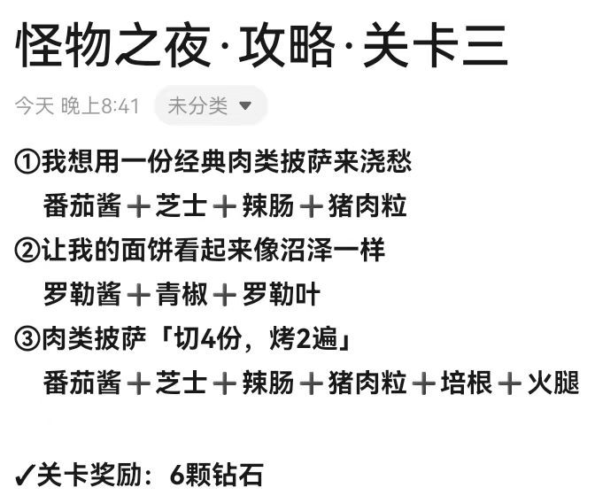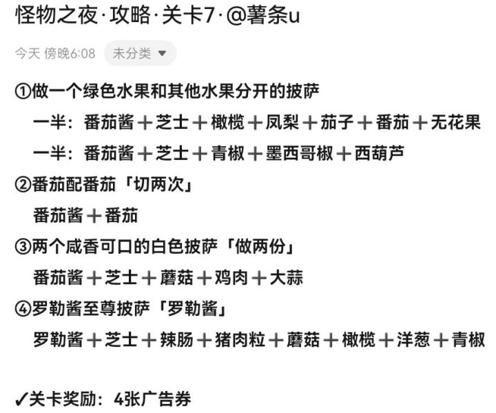 怪物之夜”关卡1“攻略1️⃣一个意大利辣肠披萨番茄酱+芝士+辣肠2️⃣两个蘑菇披萨(做2个)番茄酱+芝士+蘑菇3️⃣我想要凝视一个橄榄披萨的双眼番茄酱+芝士+橄榄(烤2遍)怪物之夜"关卡2"攻略1️⃣一半猪肉粒 一半蘑菇一半:番茄酱+芝士+猪肉粒一半:番茄酱+芝士+蘑菇双拼披萨有一刀一定要竖着切在中间!!2️⃣我想要个猪肉粒披萨番茄酱+芝士+猪肉粒3️⃣烤一个有异味的披