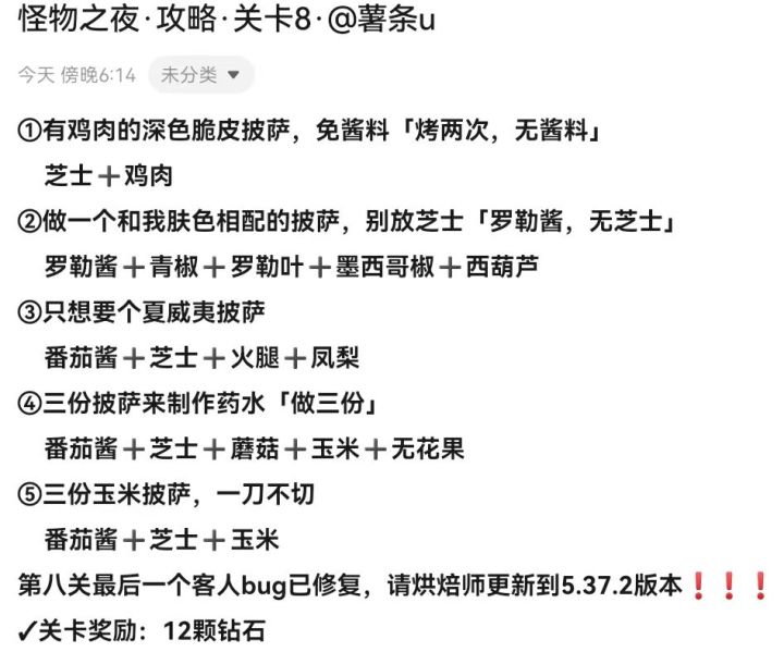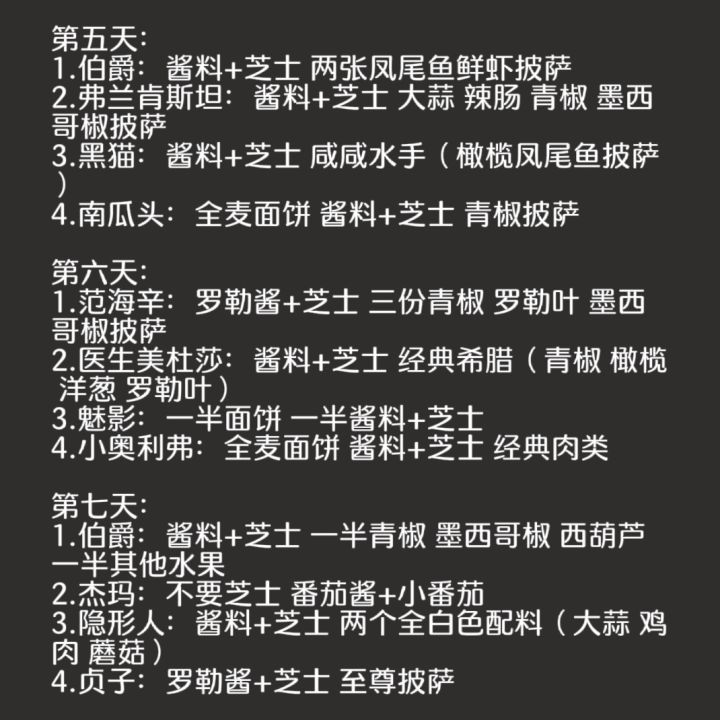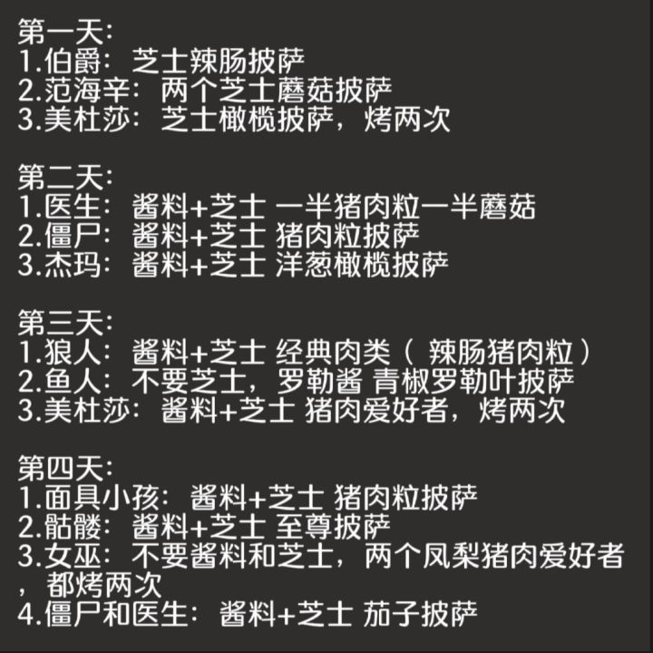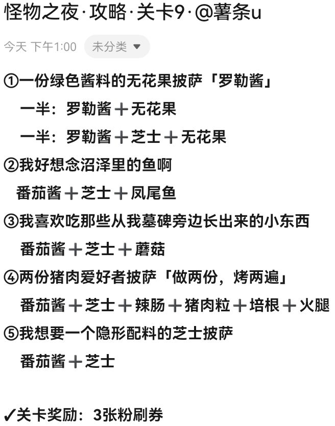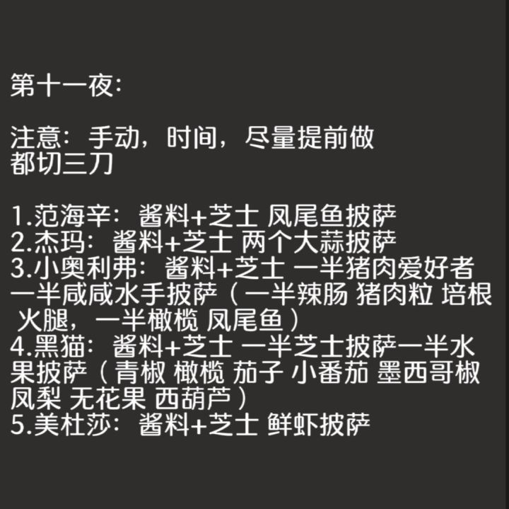 前排提醒:因字数太多,为方便大家观看,1-8关也编辑成图片,请根据需求查阅保存。#可口的比萨 第九夜:1.美杜莎伯爵: 一半芝士 罗勒酱无花果披萨2.鱼人:酱料+芝士 凤尾鱼披萨3.僵尸:酱料+芝士 蘑菇披萨4.骷髅:酱料+芝士 两份猪肉爱好者 都烤两遍5.隐形人(魔术师): 酱料+芝士 芝士披萨第十夜:1.魅影:加芝士 一半番茄酱+洋葱 玉米 大蒜 洋蓟 罗勒叶 ,一半罗勒酱+凤
