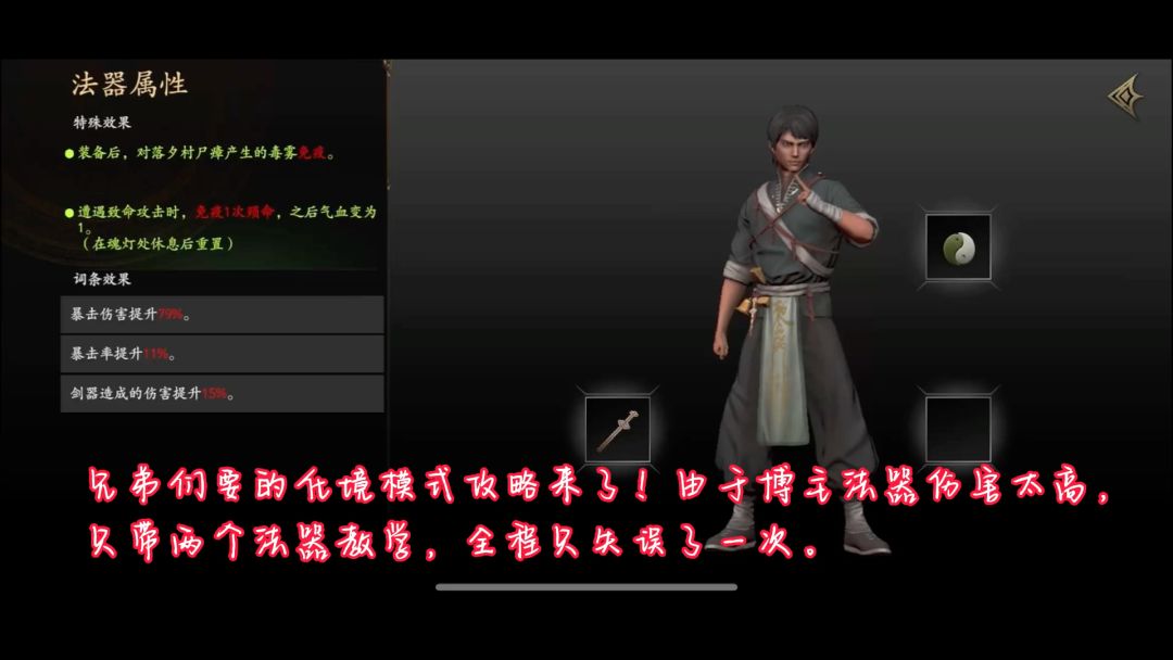 开局让他一刀,免得说我欺负他。其实白无常非常好打,小技巧,仔细看,他的戳会连续释放三次,每次间隔一个闪避a一刀的时间,三次过去他就会停下狗叫一下,这时候可以a两下或三下,最好两下别贪。然后他继续释放戳技能三次,这个时候你按上边的继续闪避a一刀就可以了。视频最后是武器属性,过了满月应该也有把十多级的剑吧,我这个就升了几级。