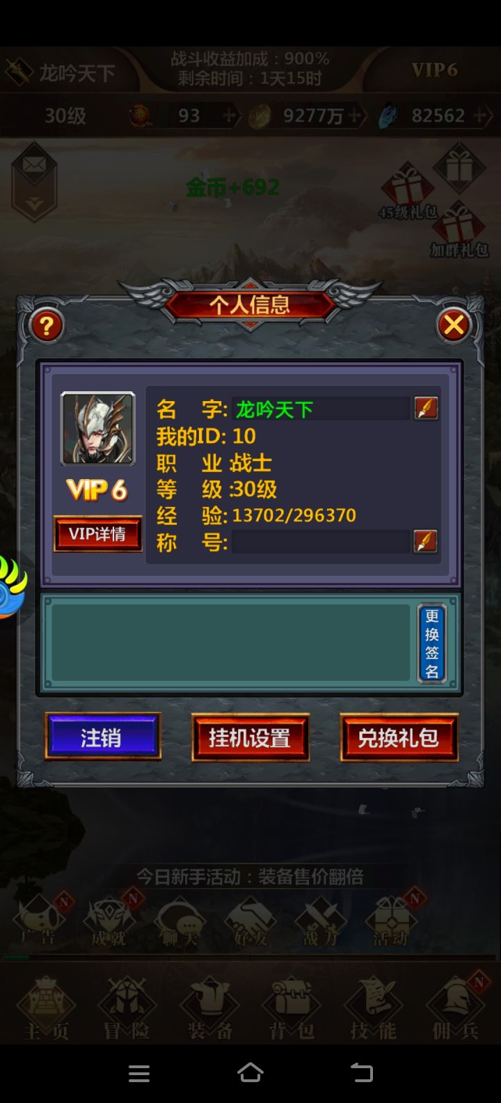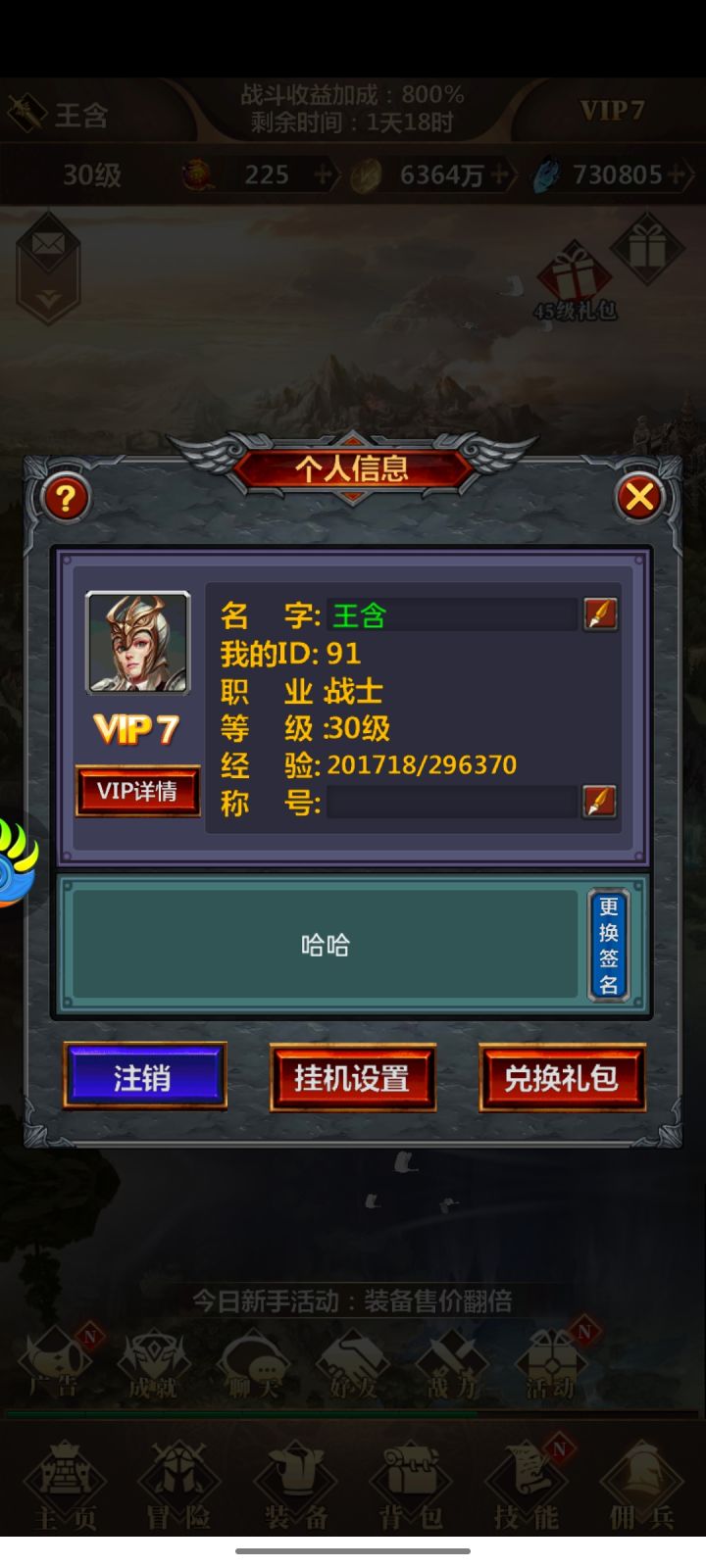 第一次玩跟随的攻略,先建角色,三职业除了天赋不同,技能都能通用,现在大佬们推荐战士,因为同战力战士吊打法师猎人,装备和技能都一样可以穿戴学习,战士可以带猎人的技能,多重射击,非常好用,开荒挂机非常适合,接着就是上线领礼包和兑换码30元充值卡加6元充值卡,把虽有能点的都点了,早点拿送的新秀套装,这样推图就容易多了如果白嫖玩家可以先用群公告有兑换码(兑换方式-点角色名-兑换礼包-输入兑换码,小技巧提前