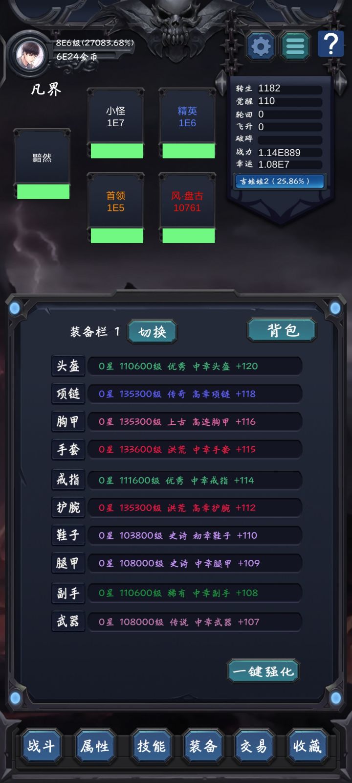 4000万界力(4E7)已经可以做完单次的历练。在飞升兑换2(7次),历练12(7次)。快速获得万界之源的方法就是:自动轮回(满),自动飞升(速飞),兑换飞升1。飞到你能飞的上限,去兑换一次飞升兑换1。具体如何处理兑换,自己想办法。注:临近超脱,万界跟全界已经没多大用处了。超脱需要1.1e8的万界之源。