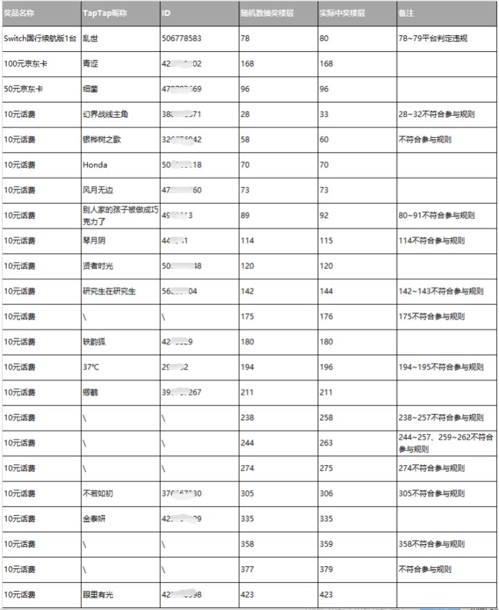 因TapTap官方活动规范调整,本次活动提前结束。为表歉意,小玉兔将开出所有奖励,来感谢热情参与的守护使大人们。后续社区将准备更多形式的福利活动,敬请期待哟(*╹▽╹*)最终中奖名单如下:抽奖结果如下:2位重新抽取:领奖方式:请中奖的守护使大人加入官方TapTap群:775380019,并在12月15日前联系管理员“可爱玉兔在线发奖”提供回复楼层截图和个人信息来领取奖励哦~—————