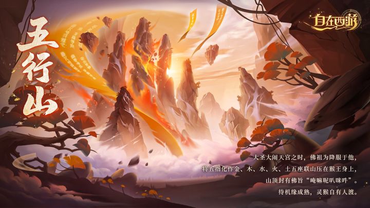孙悟空大闹天宫之时,天庭无法降服于他,无奈之下只得请来西天佛祖。大圣要与佛祖比试,却最终没有飞出佛祖的手掌心。为镇压他,佛祖翻掌将五指画作金、木、水、火、土五座联山,唤作“五行山”。大圣欲挣脱束缚,佛祖又降佛旨“六字箴言”贴于五行山顶,自此大圣再无法挣脱。佛祖有心度大圣成正果,便教此处的土地与五方揭谛在他饥时喂铁丸、渴时喂铜汁,以待有缘人。而后唐王征西定国将“五行山”改名“两界山”,一面为大