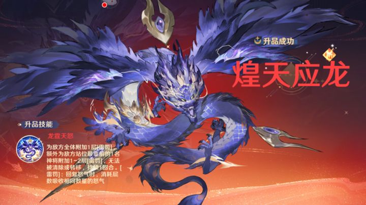 天下龙裔皆为祖龙子孙,应龙亦不例外,当远古荒灵与应龙融合之后,其体内的祖龙精魄彻底唤醒了应龙的始祖血脉化身煌天应龙,如今的它气势无匹,掌控雷电!解锁煌天应龙后,可以激活煌天应龙的技能——龙霆天怒。技能解析 龙霆天怒:为敌方全体附加1层[雷罚],额外为敌方站位最靠前的1名神将附加1~2层[雷罚],无法被清除或转移,持续1回合。[雷罚]:回复怒气时,消耗层数吸收相同数量的怒气。 煌天应龙的技